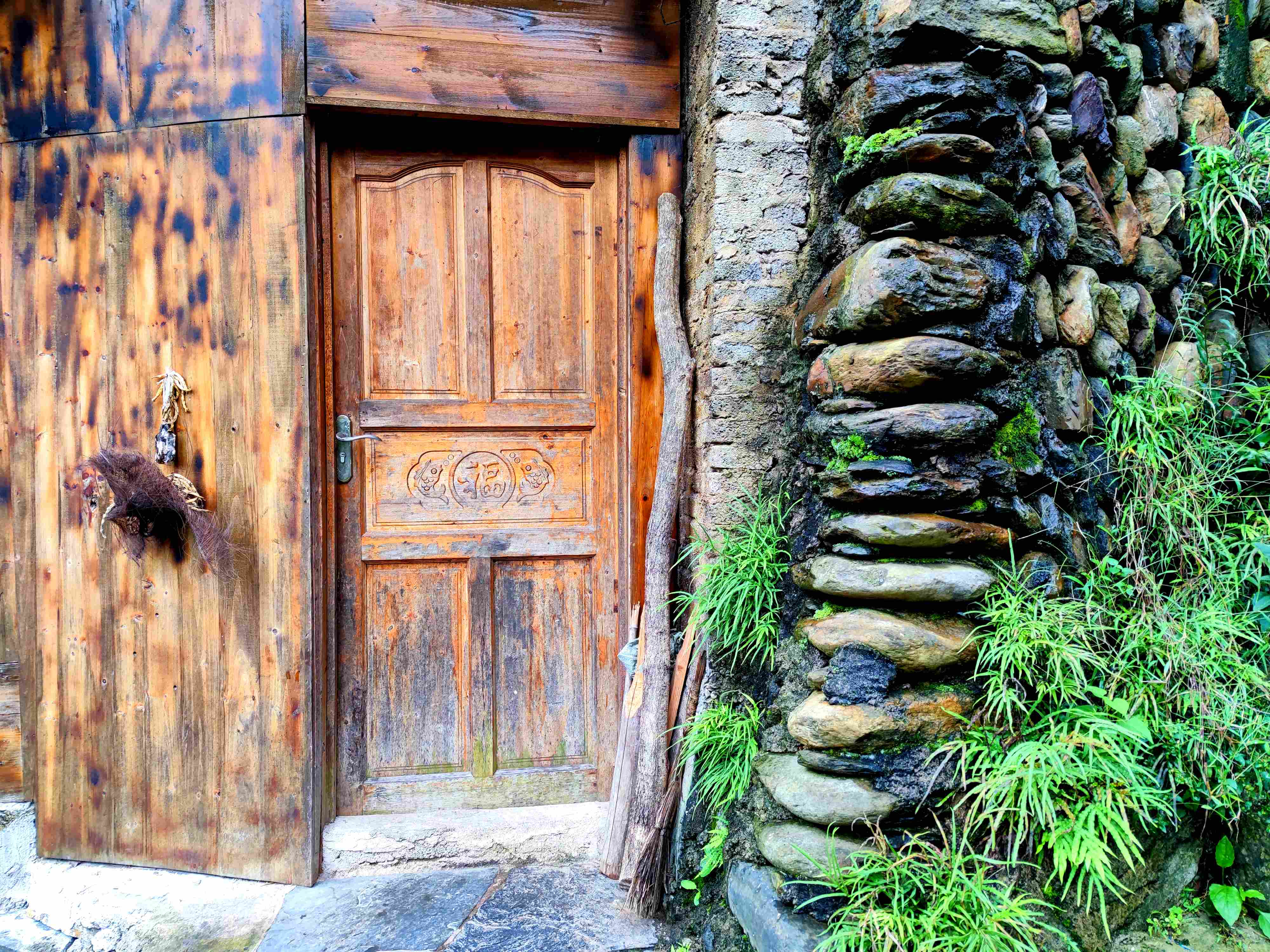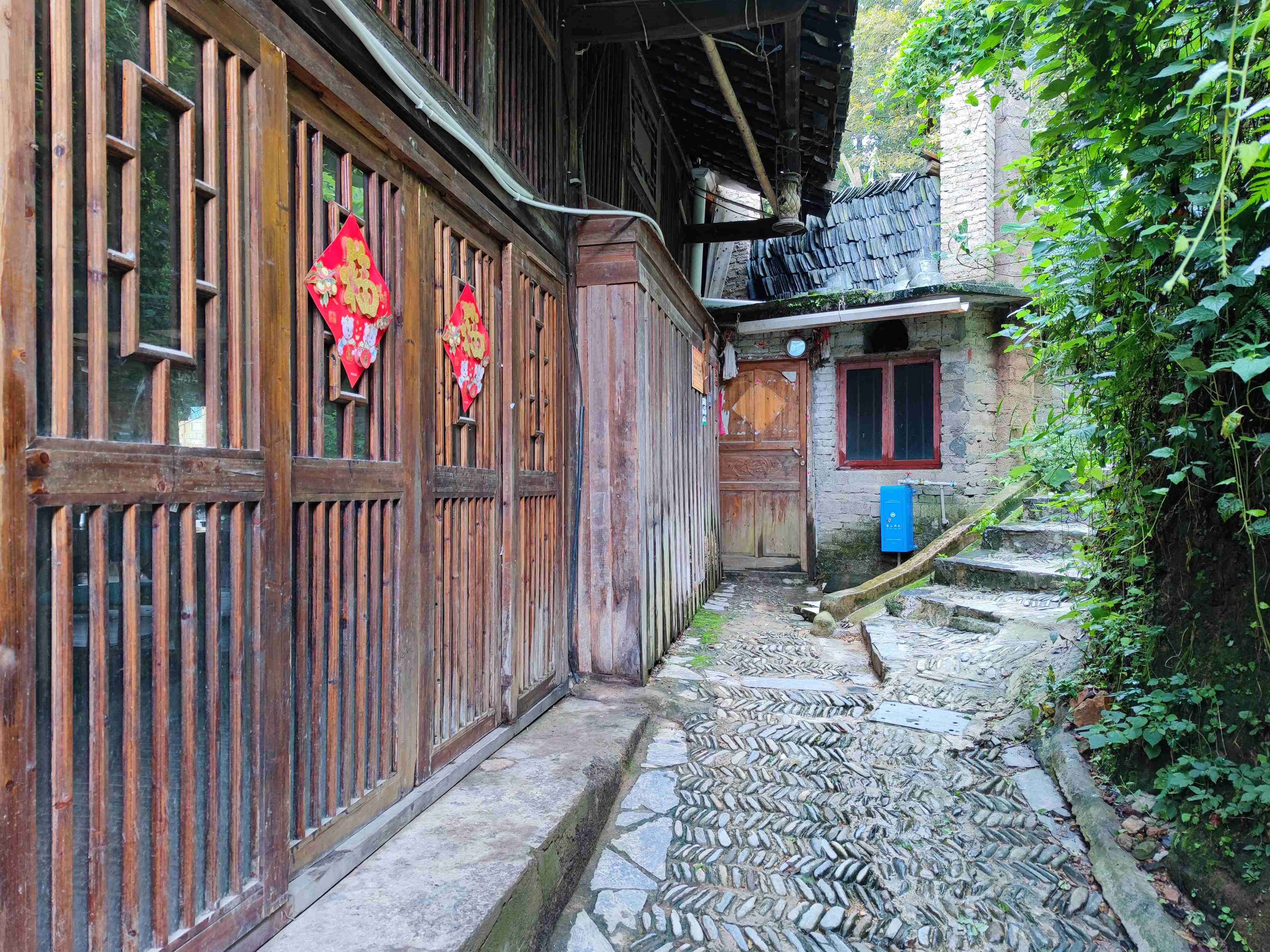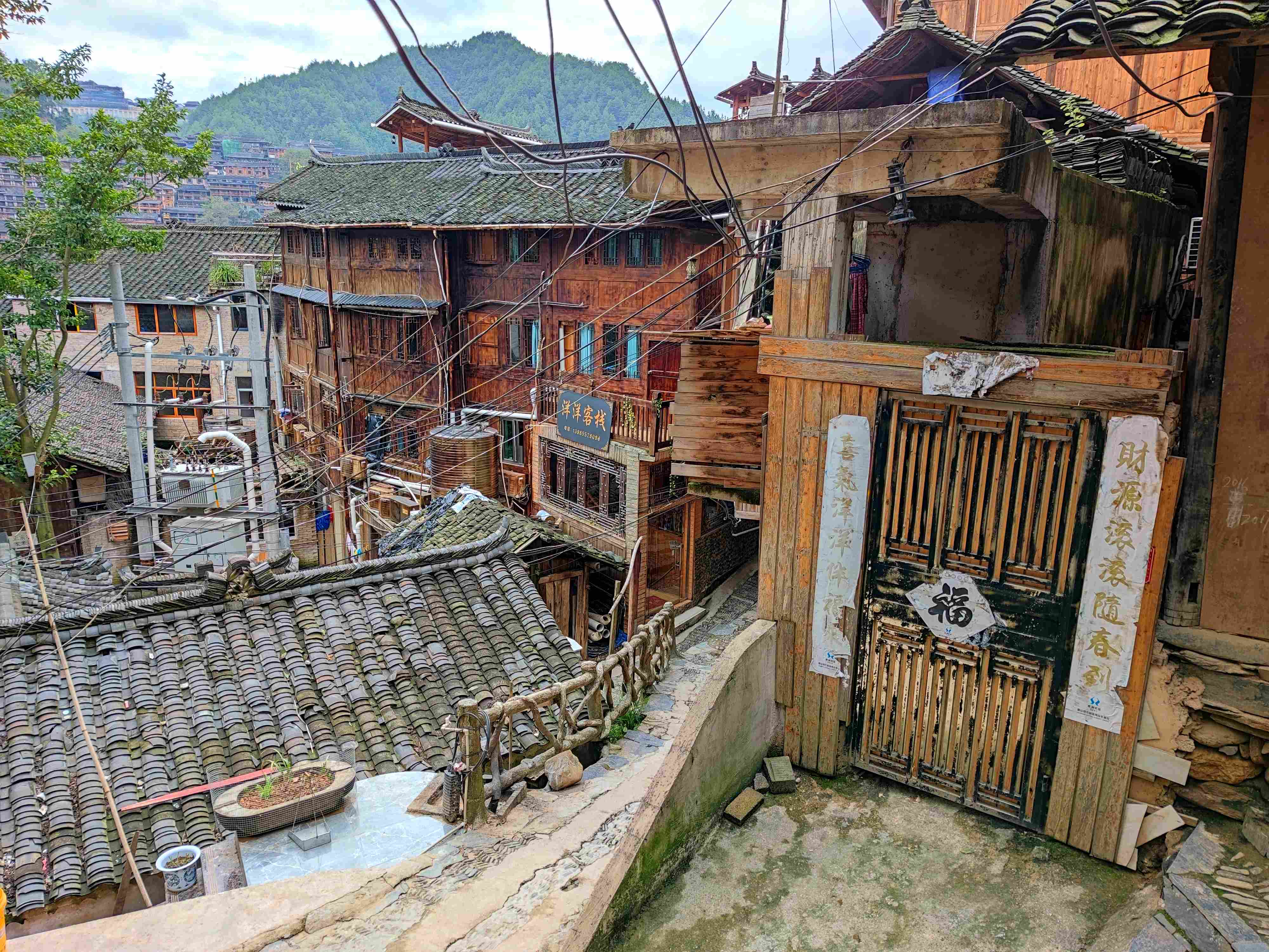 Quelques Miao sont assis et discutent, d’autres grimpent les nombreuses marches avec des marchandises suspendues sur un bambou. Leur dialecte m’est inconnu, je ne comprends pas un mot de leurs conversations. On passe devant de belles maisons en bois, et on a une vue différente du village.