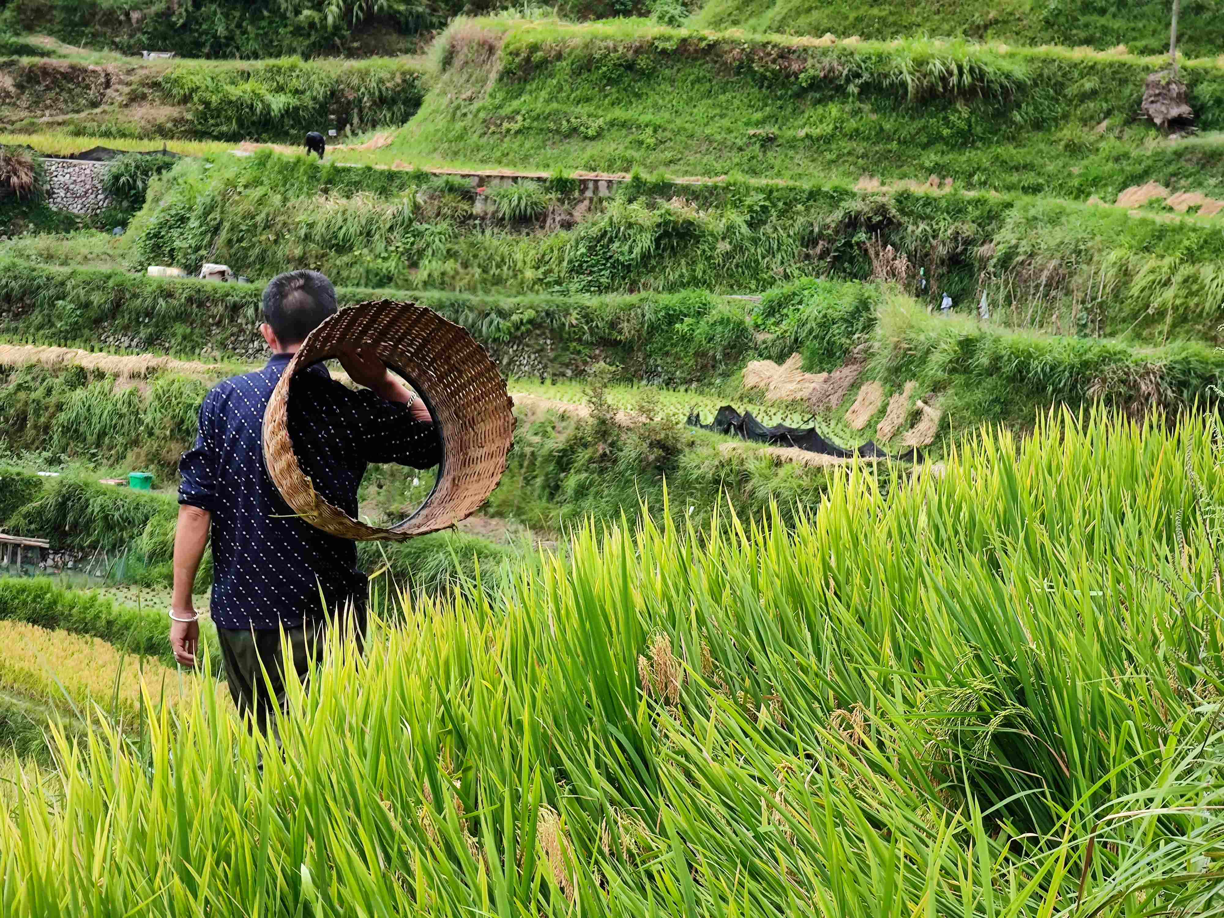 On grimpe au milieu des rizières pour avoir un point de vue sur cette vallée et le village de Xijiang au fond. Il n’y a plus personne, on s’installe et profite de la vue.