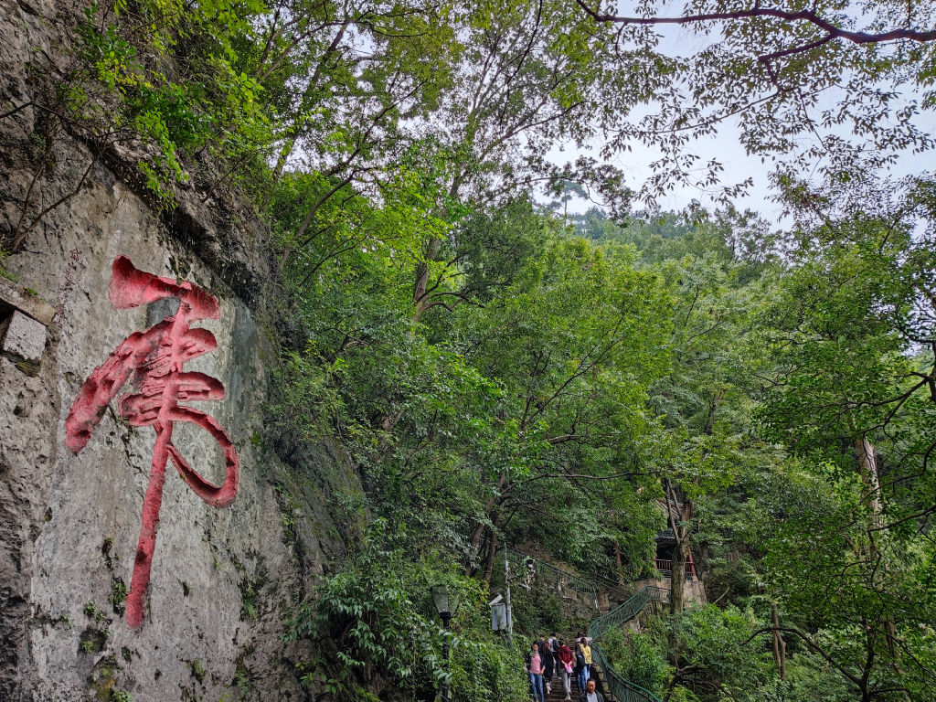 Des caractères chinois sont inscrit dans la roche en bordure du chemin vers le temple