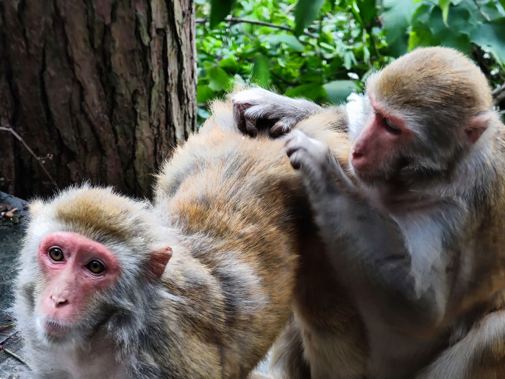 Puis arrive quelqu’un pas comme les autres. Ce jeune semble avoir une malformation et boite lorsqu’il marche. Il porte un gros sac à dos noir sur son ventre. Il semble particulièrement à l’aise avec les singes et leur parle avec autorité, les singes semblent l’écouter et le craindre. Dans son sac, il a pleins de cacahuètes qu’il donne une par une aux singes. Il vient nous voir et on entame la discussion. Cet homme-là qui n’a pas de famille vient en fait tous les jours à pied de chez lui, marche 5h par jour dans le seul but de nourrir les singes, il s’en est fait sa mission de vie. Il nous raconte qu’il ne travaille pas mais que quelqu’un lui donne de l’argent pour acheter les cacahuètes qu’il amène quotidiennement. Il vient ici depuis qu’il est enfant, et il nous dit connaitre beaucoup de choses sur ces bandes de singes, car oui il y en a plusieurs qui habitent ces montagnes et chacun à son territoire. Il nous fait approcher des singes qui sont beaucoup plus gentils et doux maintenant que l’on a été introduit. Puis il nous propose de partir à la rencontre des autres colonies du parc, nous acceptons sans hésiter. Certains singes sont agressifs, d’autres peureux, d’autres joueurs, certains paresseux. Leurs expressions de visage et attitudes semblent parfois si proches des nôtres.
