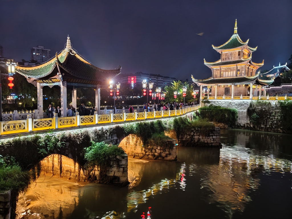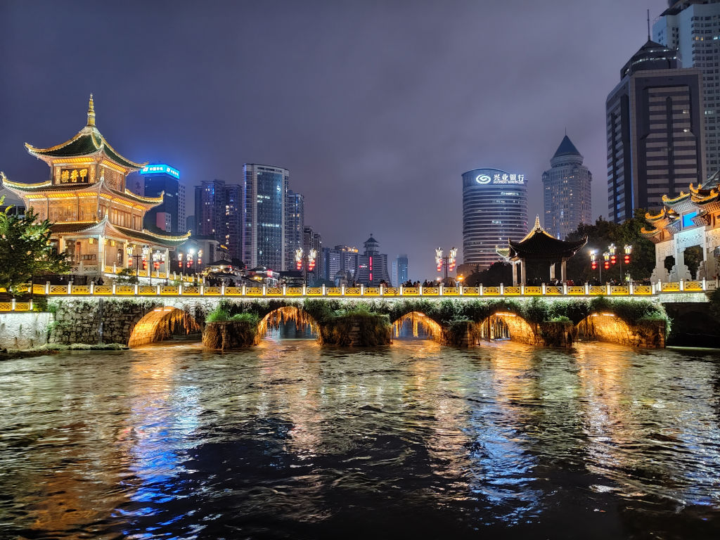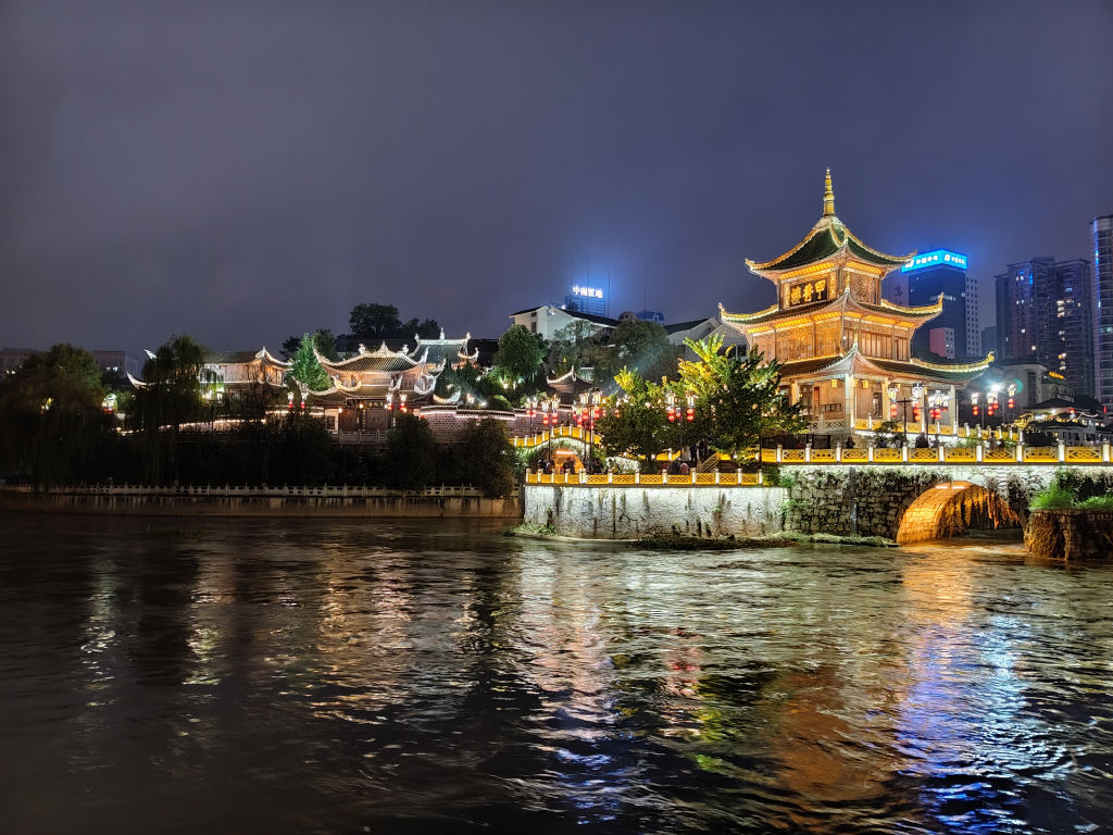 Nous continuons notre visite de Guiyang par une des vues les plus classiques de la ville, dans le quartier du pavillon de Jiaxiu, construit au XVIe siècle. Ici, le plus beau c’est la nuit lorsque toutes les lumières du monument sont éclairées. Il faut attendre un peu plus d’une heure, on décide donc de mettre ce temps à profit pour manger une spécialité du Sud-Ouest de la Chine, une fondue de champignon. Un plat que j’adore avec de superbes saveurs de champignons qui imprègne ce que l’on plonge dans le bouillon. La nuit est tombée, on ressort pour se promener autour de la rivière qui est maintenant toute illuminée.