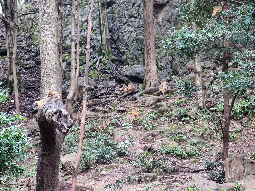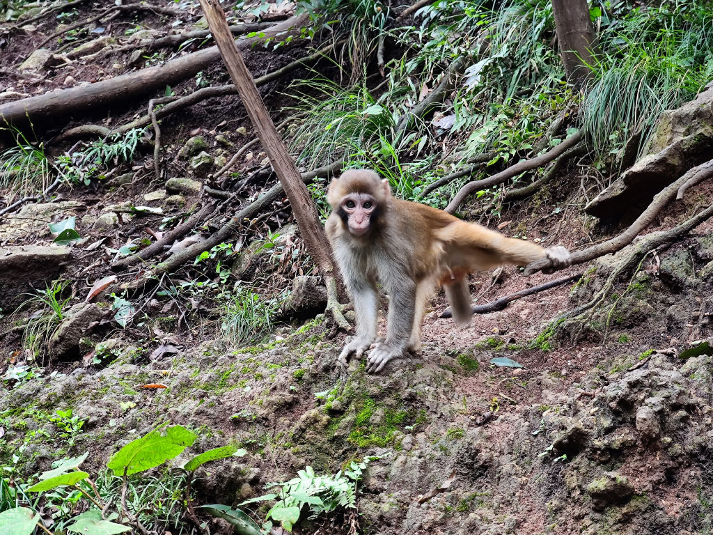 On s’installe et regarde un moment ce spectacle amusant de singes qui malmènent les humains. Ils sont très agiles et surs d’eux, ils n’ont pas peur et la plupart des gens leur jettent l’objet convoité avant qu’ils ne leur sautent dessus. Il est possible de prendre un petit chemin qui grimpe tout en haut de la montagne, dans le domaine des singes, là où la terre est grattée, mais personne ne semble avoir le courage de s’y aventurer. Un panneau rappelle le danger et l’attitude à observer. Depuis la route, on peut voir qu’il y au moins une trentaine de singes là-haut sur le chemin.