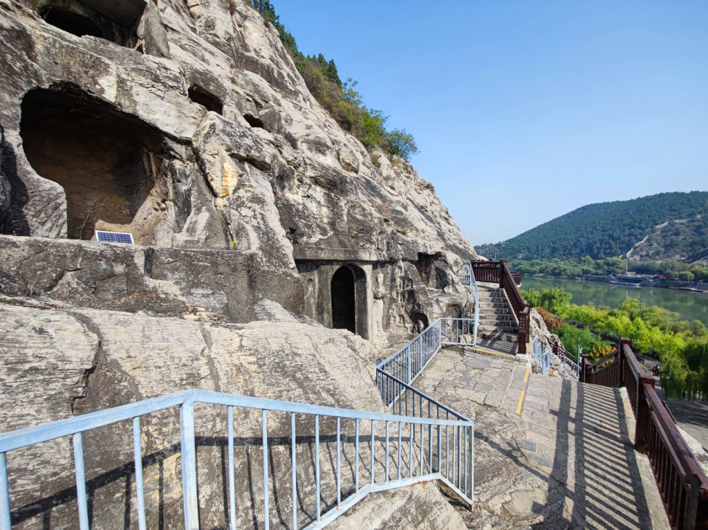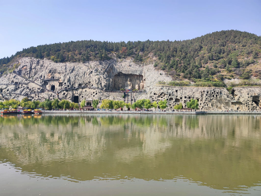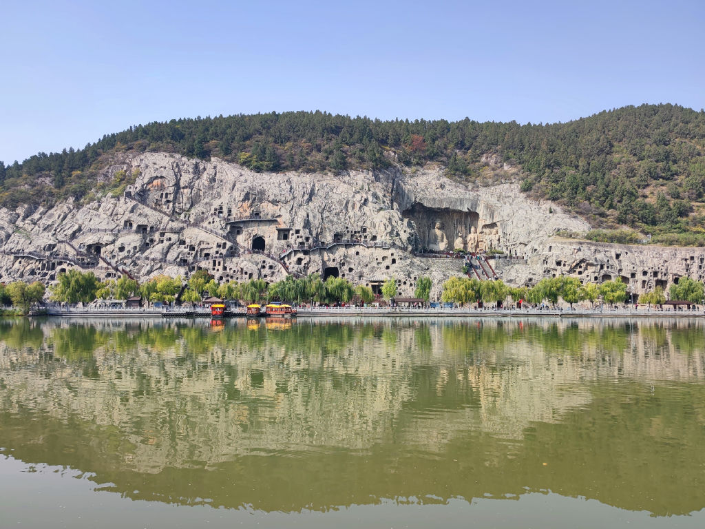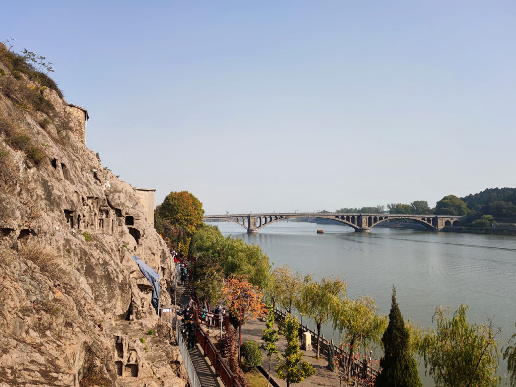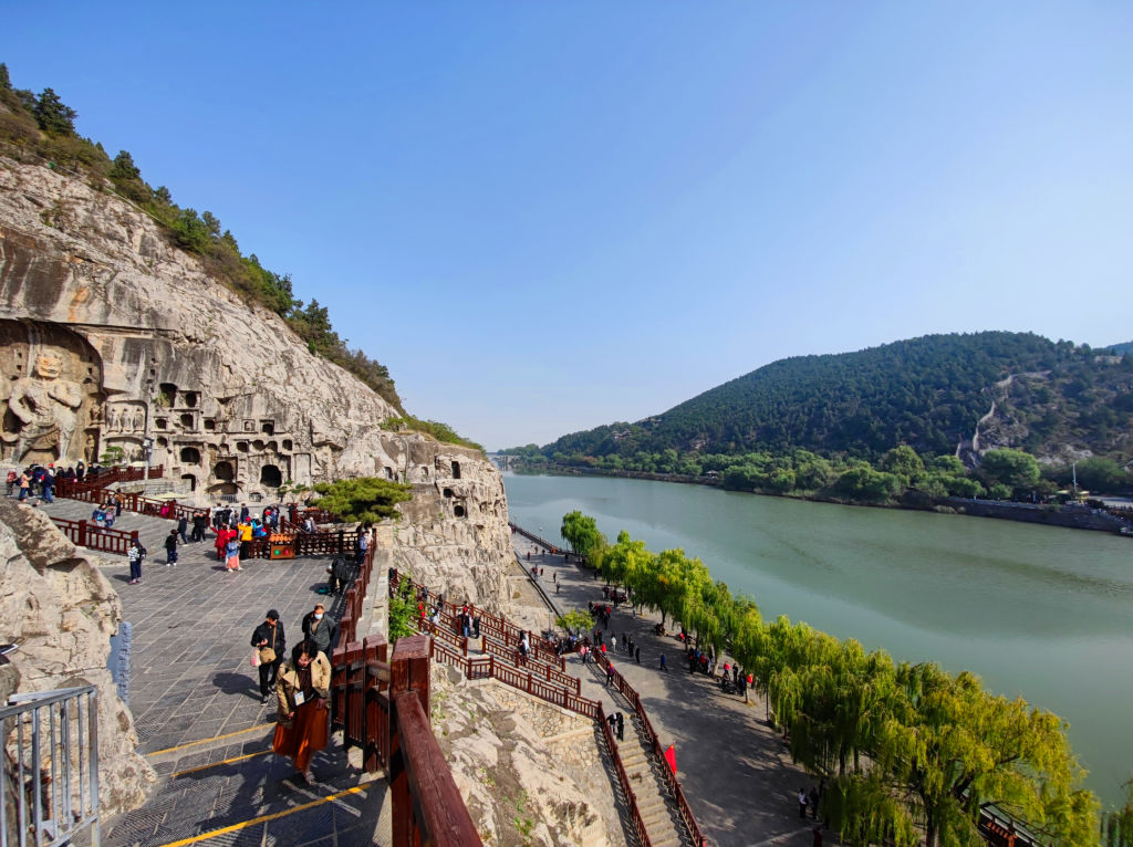 En traversant le pont, on accède à un autre point de vue sur les grottes. La vue sur la totalité de Longmen est grandiose avec le grand bouddha en face.