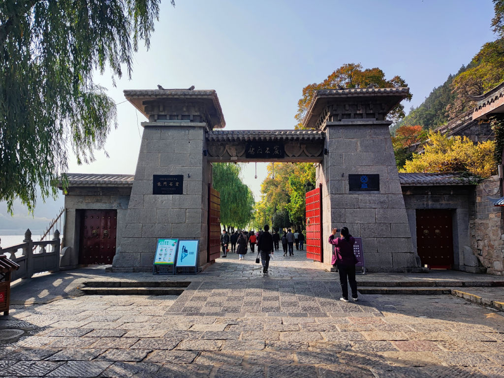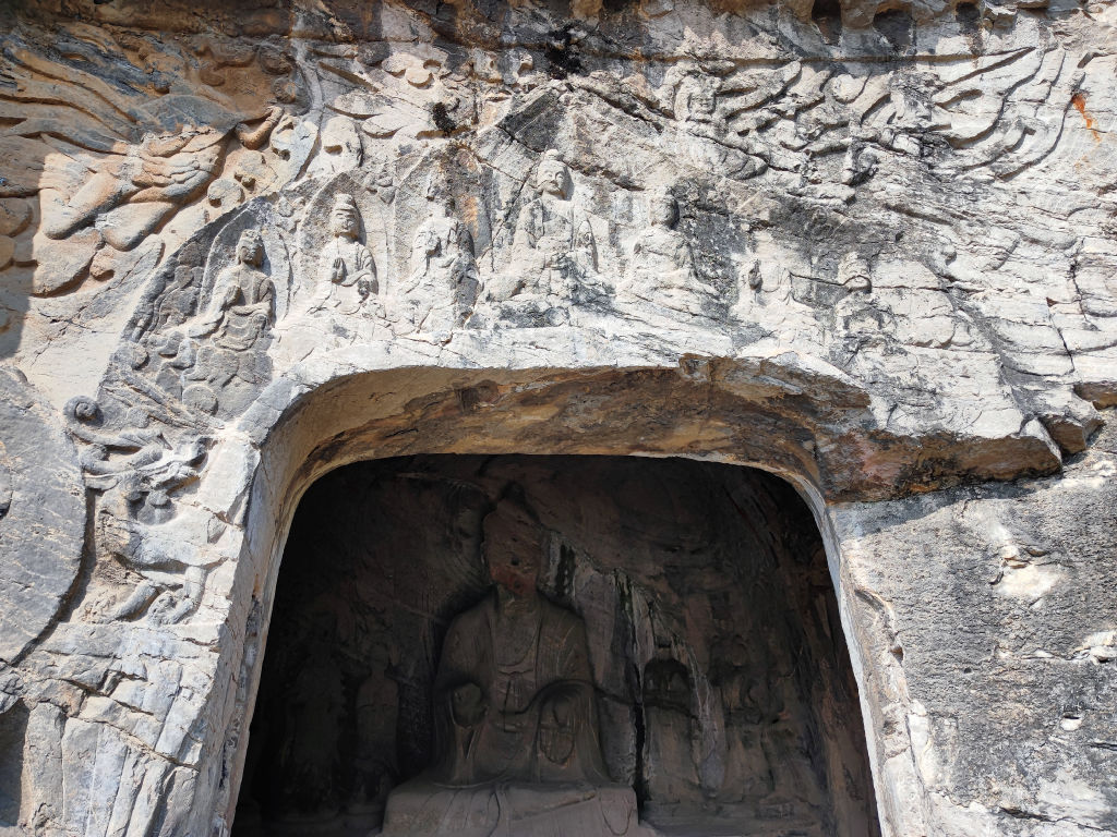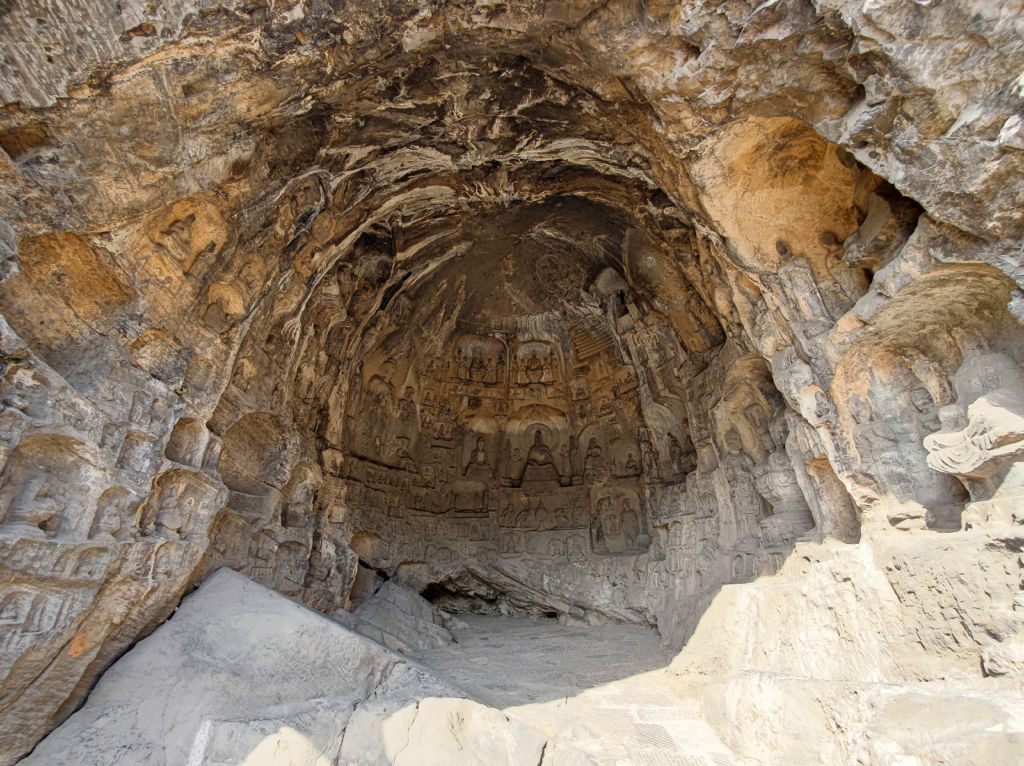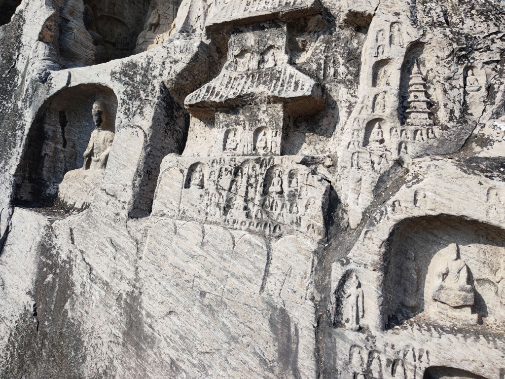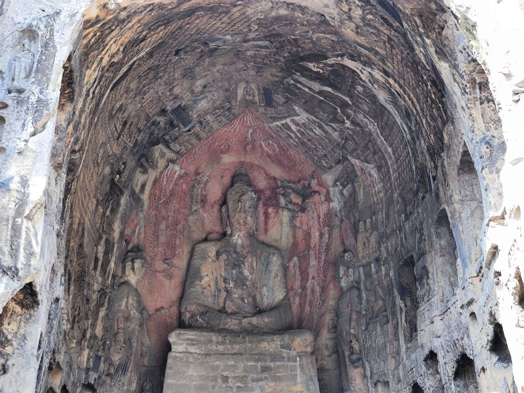 L’entrée des caves a été aménagé comme un village traditionnel chinois, le résultat est pour le coup assez réussi. Il faut dire qu’il est possible de visiter les caves de nuit, elles sont alors toutes illuminées, à mon avis cela doit vraiment valoir le coup, car contrairement à Yungang, ici les cavités sont exposées au soleil donc tous les pigments ont disparu. Les jeux de lumières doivent surement créer une ambiance particulière. Le site s’étend sur un kilomètre le long des berges du fleuve Yi, un affluent du Fleuve Jaune, qui coule au Nord de Luoyang.