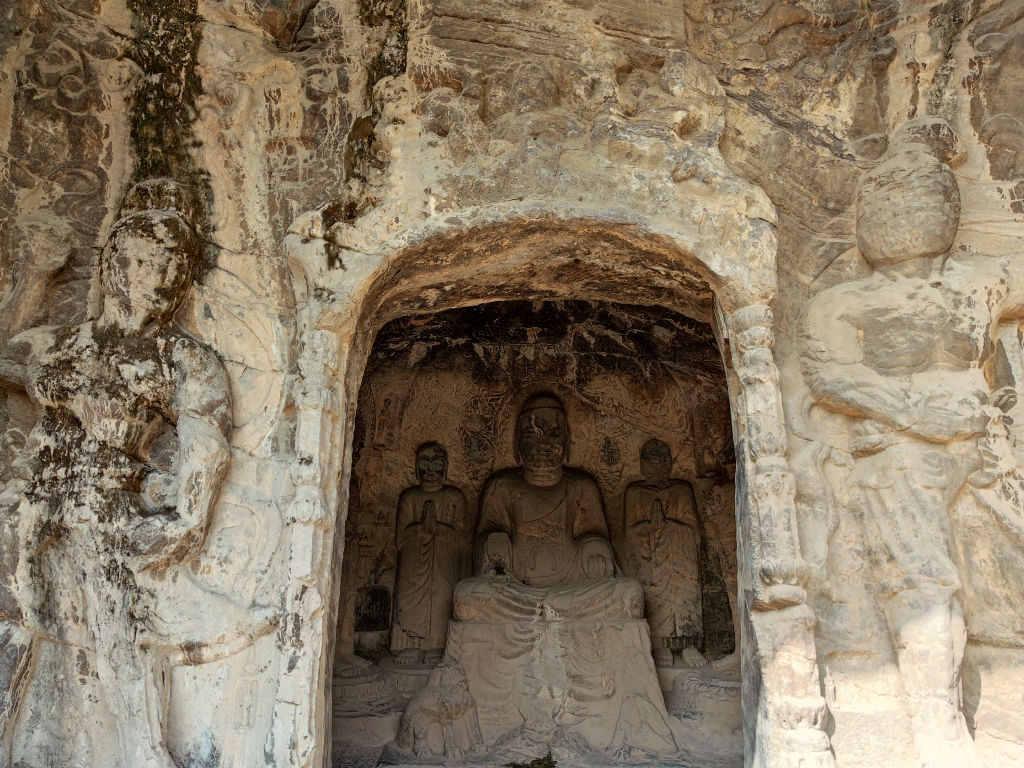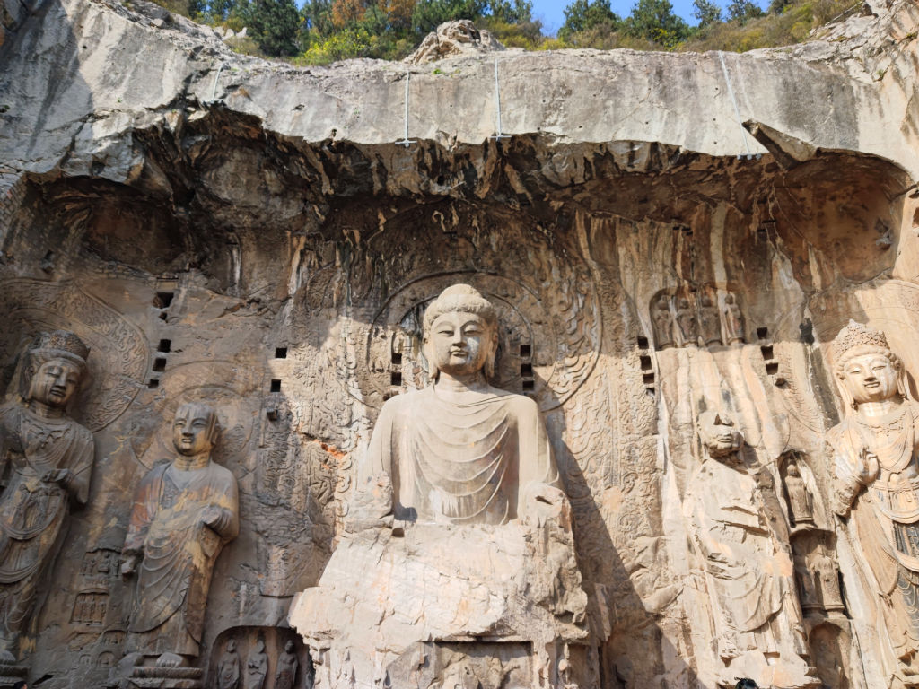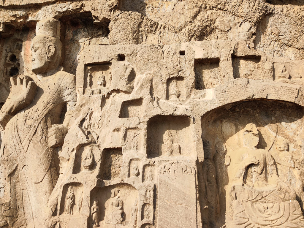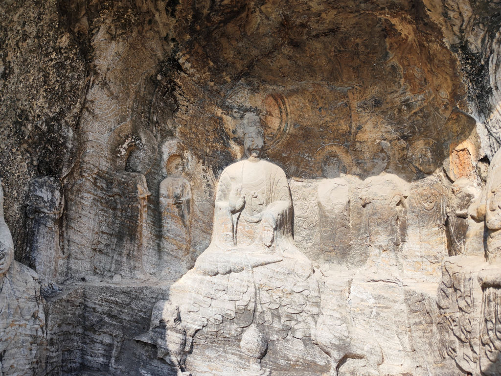 Les caves de Longmen ont été construit au Sud de la ville de Luoyang par la dynastie des Wei du Nord, après la relocalisation de la capitale de Datong à Luoyang. Issus des steppes du grand nord chinois, ce peuple s’est peu à peu sinisé. Dans un esprit de plus grande intégration, l’empereur a déplacé le cœur de son pouvoir dans la grande plaine du fleuve jaune, au plus près du centre de gravité de la civilisation chinoise, finalisant l’intégration des Wei à la Chine. Leur art s’exprimait avant tout dans la sculpture des caves bouddhiques, une pratique dont l’origine vient de l’Ouest de l’Inde et a voyagé grâce à la diffusion du Bouddhisme jusqu’au Nord de la Chine. Les caves de Yungang (que j’avais déjà visité, voir l’article ici) sont vraiment l’apothéose de la création des Wei du Nord. A Luoyang, on trouve la prolongation de cette pratique, qui va se poursuivre lors des dynasties suivantes.