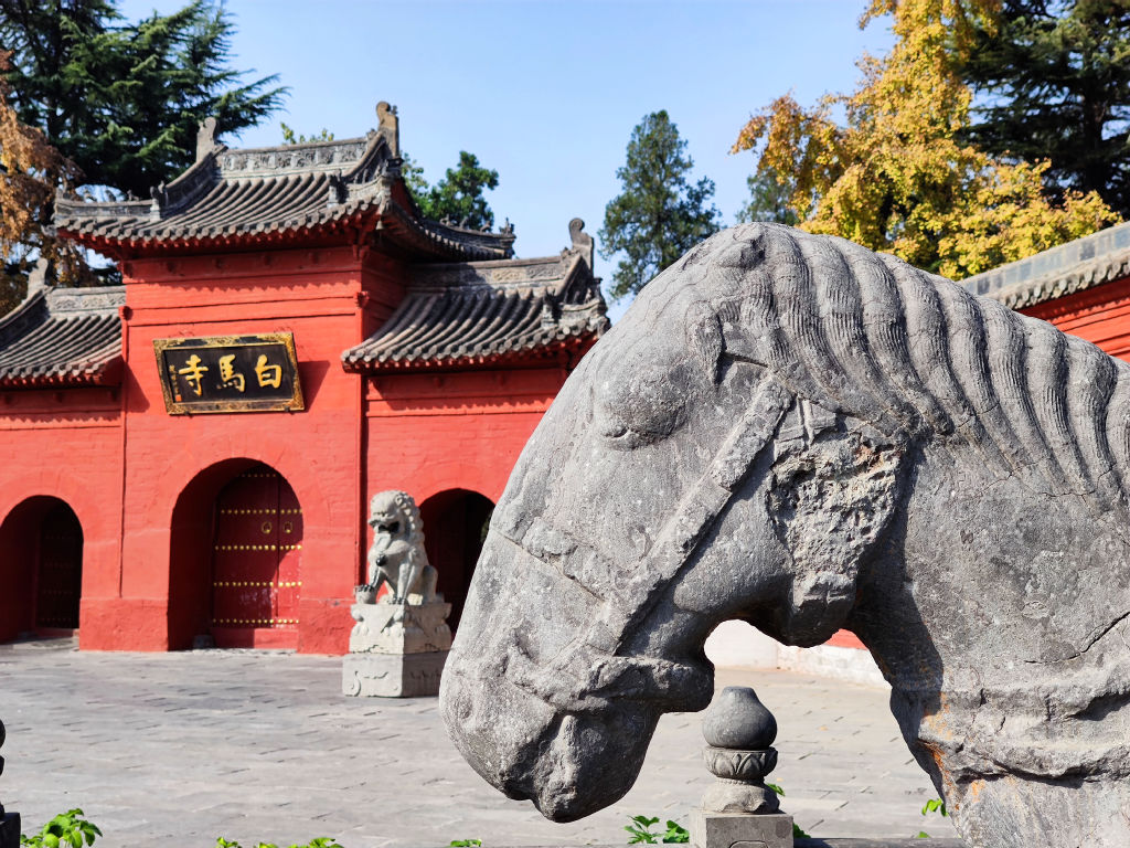A côté de la zone internationale, on accède au Baima Si. Deux scupltures de chevaux ont été installées devant la porte du temple.