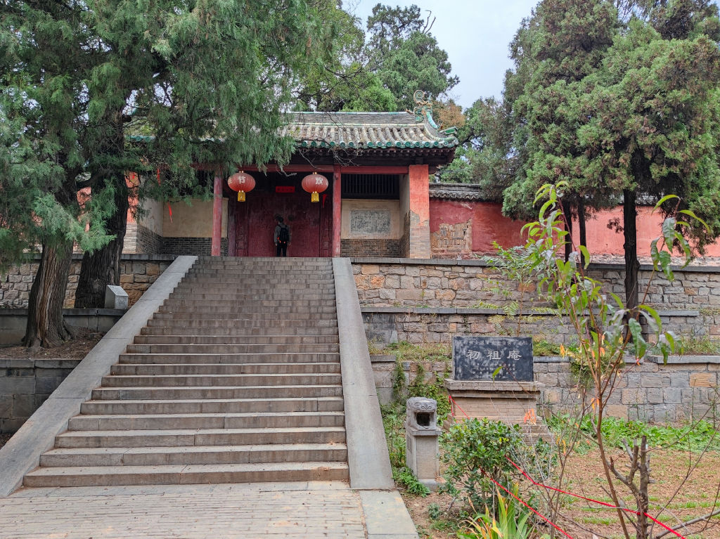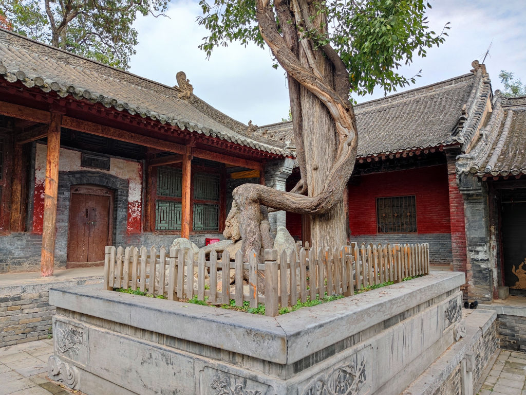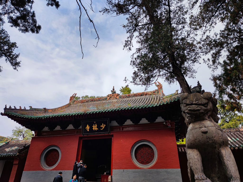 On commence par manger dans la cantine du temple, une cuisine qui ne sert que de la nourriture végétarienne, il n’y a pas de carte, le menu imposé est à 60 RMB par personne. Beaucoup de tofu et de légumes. Cela nous requinque pour la suite de la journée. Ensuite on pénètre dans le temple. Shaolin a été l’objet de nombreuses attaques dans le passé. Il a été complétement brulé en 1928 et reconstruit depuis. Certains batiments ont un aspect neuf mais on trouve quelques éléments historiques, comme cette statue à l'entrée.