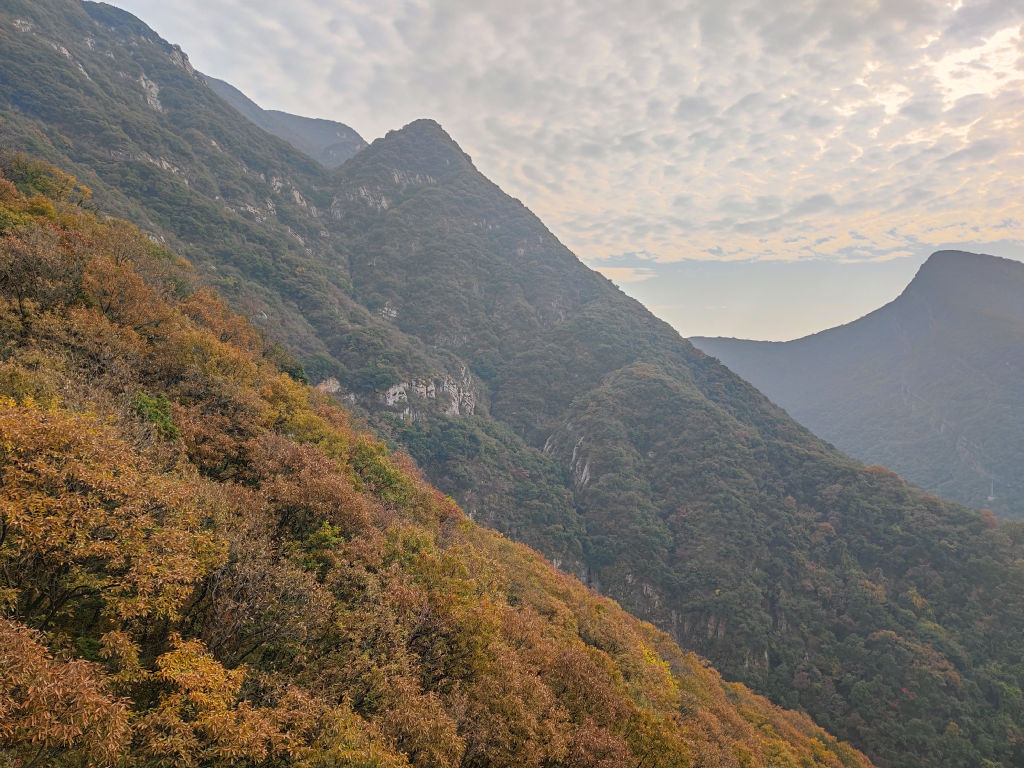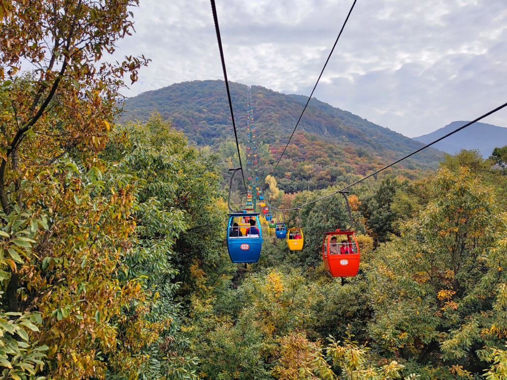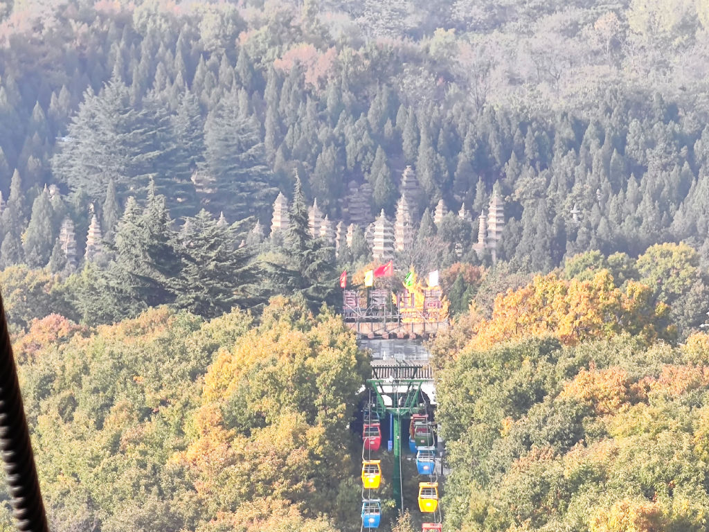 La télécabine nous emmène sur un point de vue plus élevé. La vue depuis les bennes sur la vallée de Shaolin est magnifique, les feuilles ont des superbes couleurs automnales.