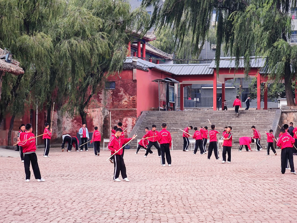 On passe devant un des centres d'entrainement au Kung Fu de Shaolin, les enfants font tournoyer leur baton au dessus de leur tête