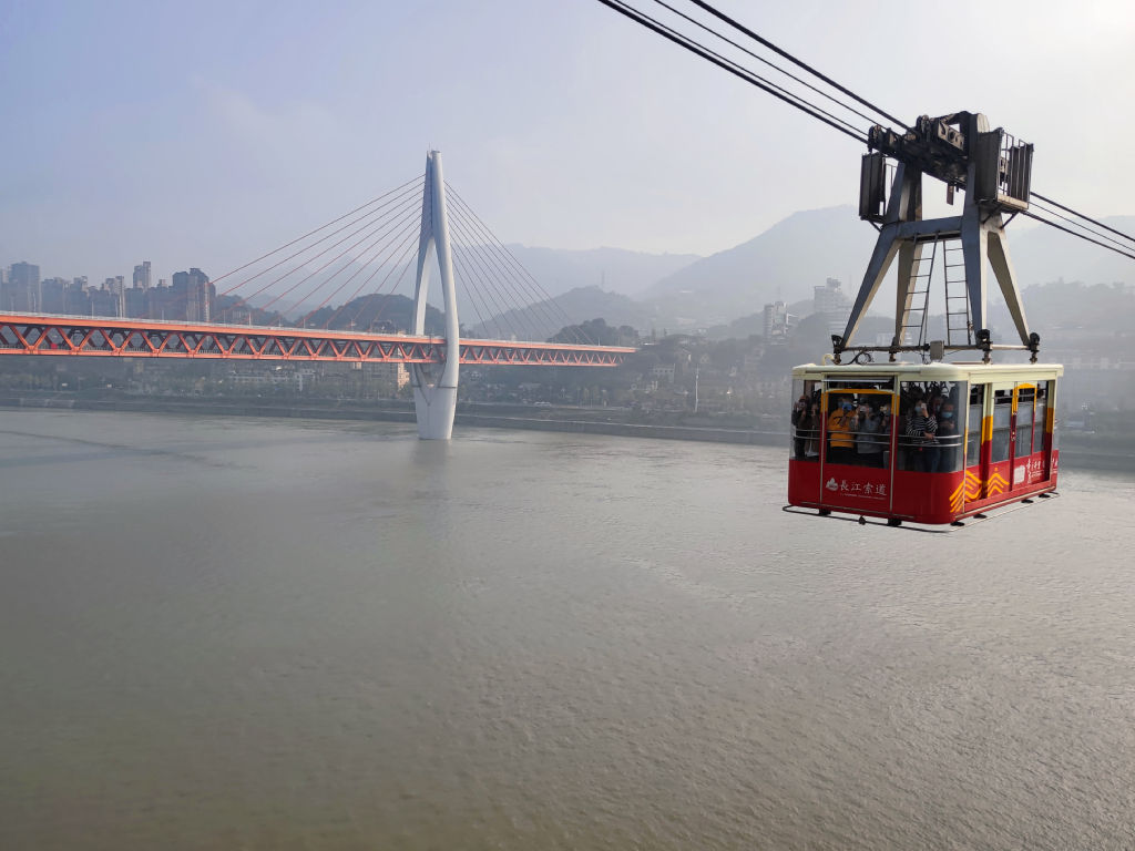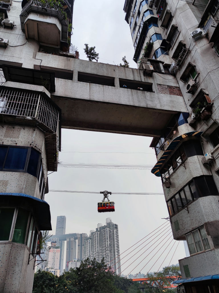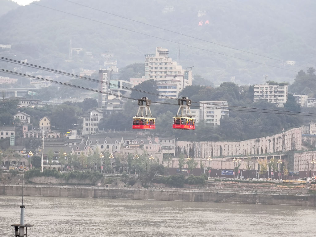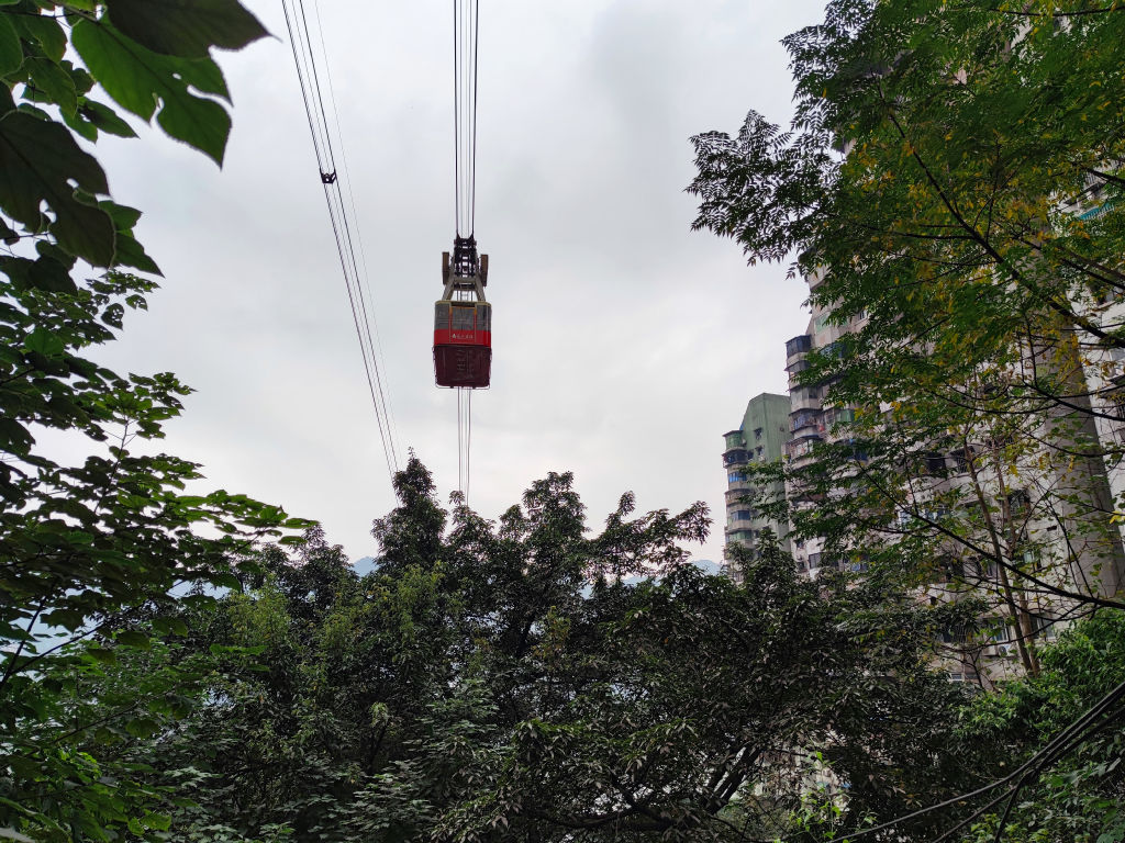 Une cabine rouge du téléphérique de Chongqing passe au dessus de nos têtes. A l'origine un moyen de transport réalisé pour relier les différentes rives des fleuves et connecter les différents quartiers, c'est aujourd'hui devenue une des attractions les plus connues et courues de Chongqing. Il faut dire que ce téléphérique a beaucoup de charme, et il a été vu dans de nombreux films chinois qui se sont déroulés dans la ville de Chongqing, et ce téléphérique était un lieu idéal.