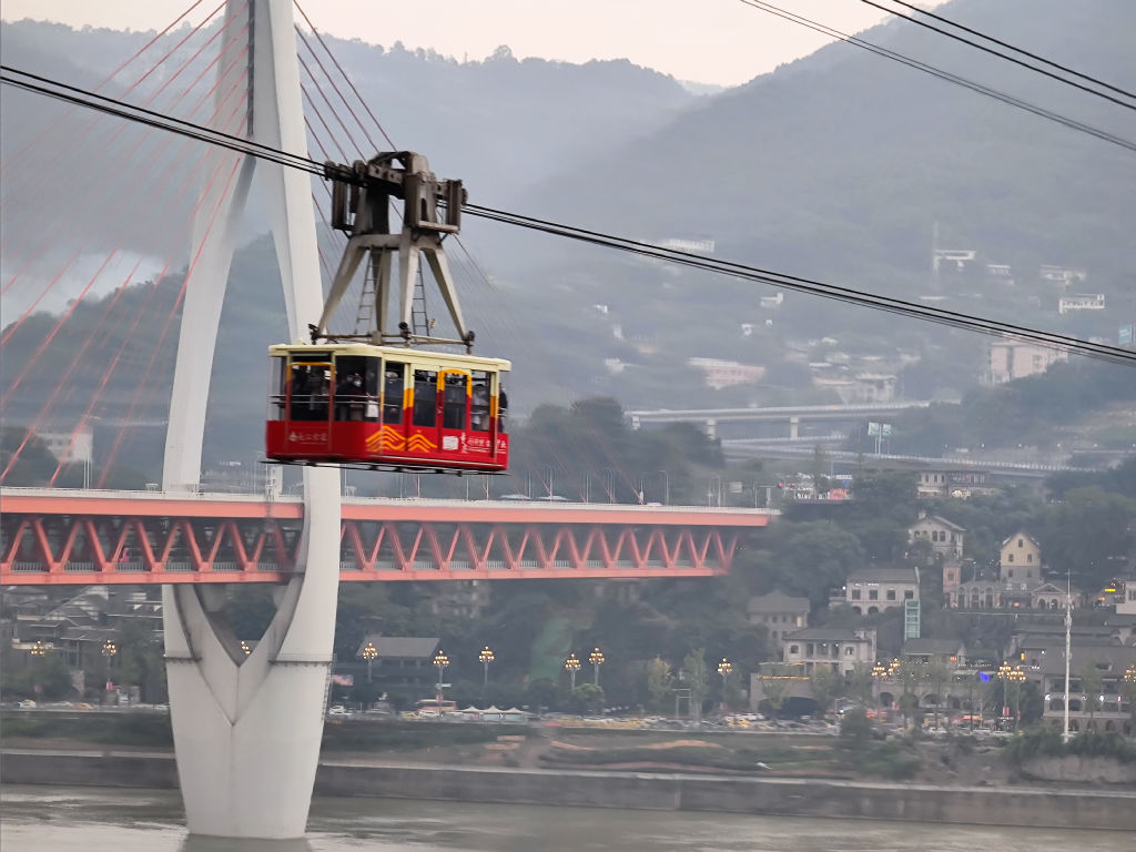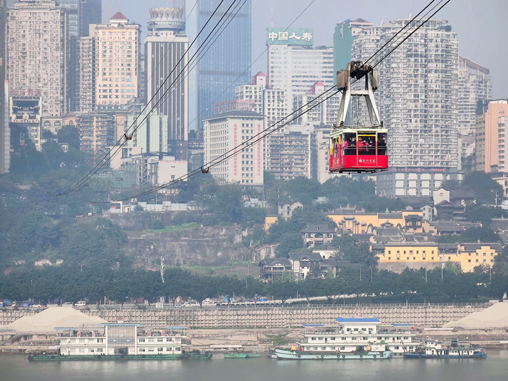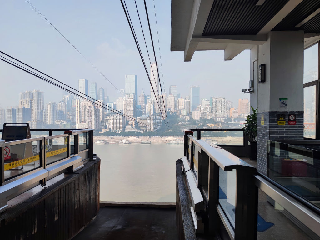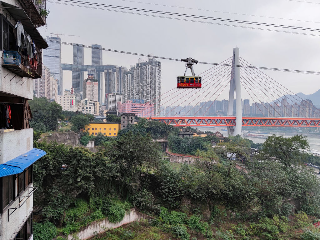 Une cabine rouge du téléphérique de Chongqing passe au dessus de nos têtes. A l'origine un moyen de transport réalisé pour relier les différentes rives des fleuves et connecter les différents quartiers, c'est aujourd'hui devenue une des attractions les plus connues et courues de Chongqing. Il faut dire que ce téléphérique a beaucoup de charme, et il a été vu dans de nombreux films chinois qui se sont déroulés dans la ville de Chongqing, et ce téléphérique était un lieu idéal.