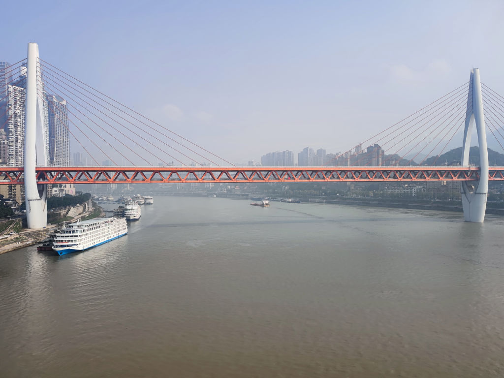Sur le fleuve Jialing, de nombreux ponts ont été construits, ici trois ponts enjambent le fleuve dont un pont spécial pour le métro qui relie le quartier historique de Yuzhong et le quartier financier du Nord de Chongqing.
