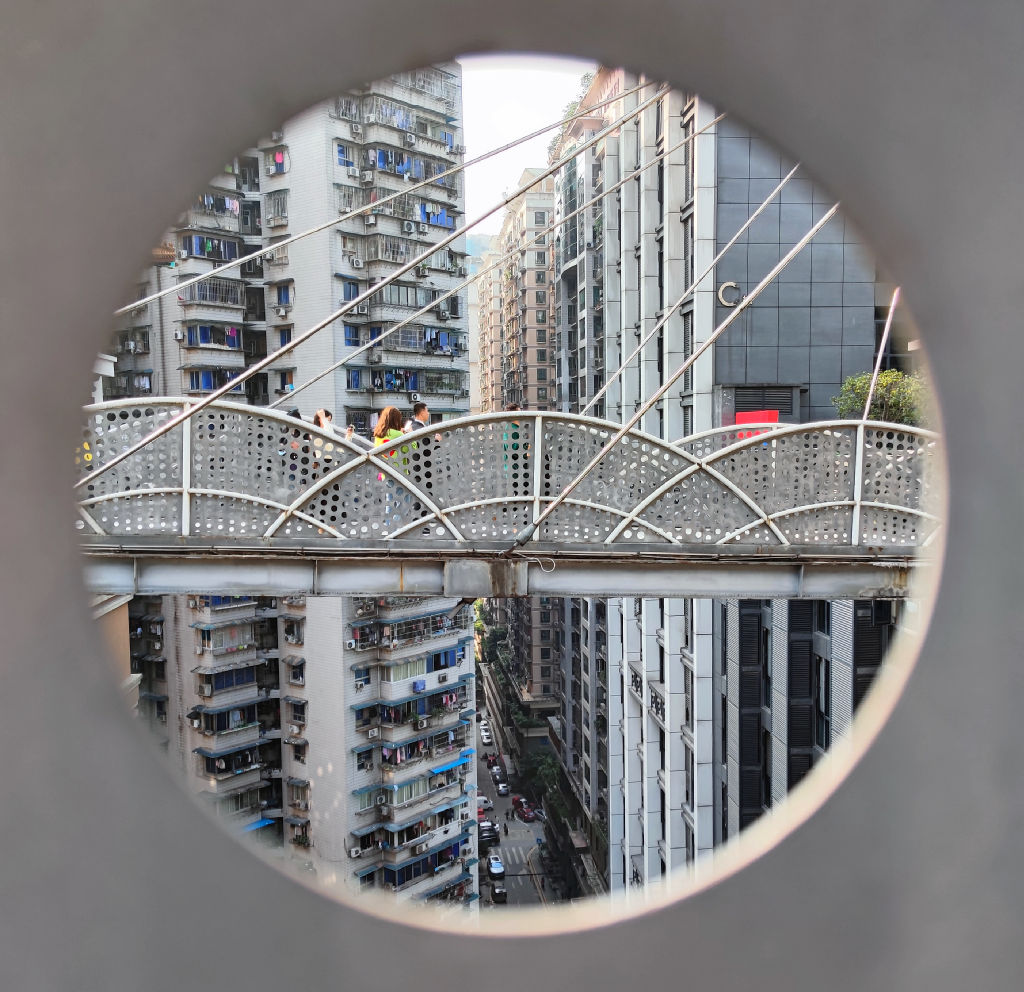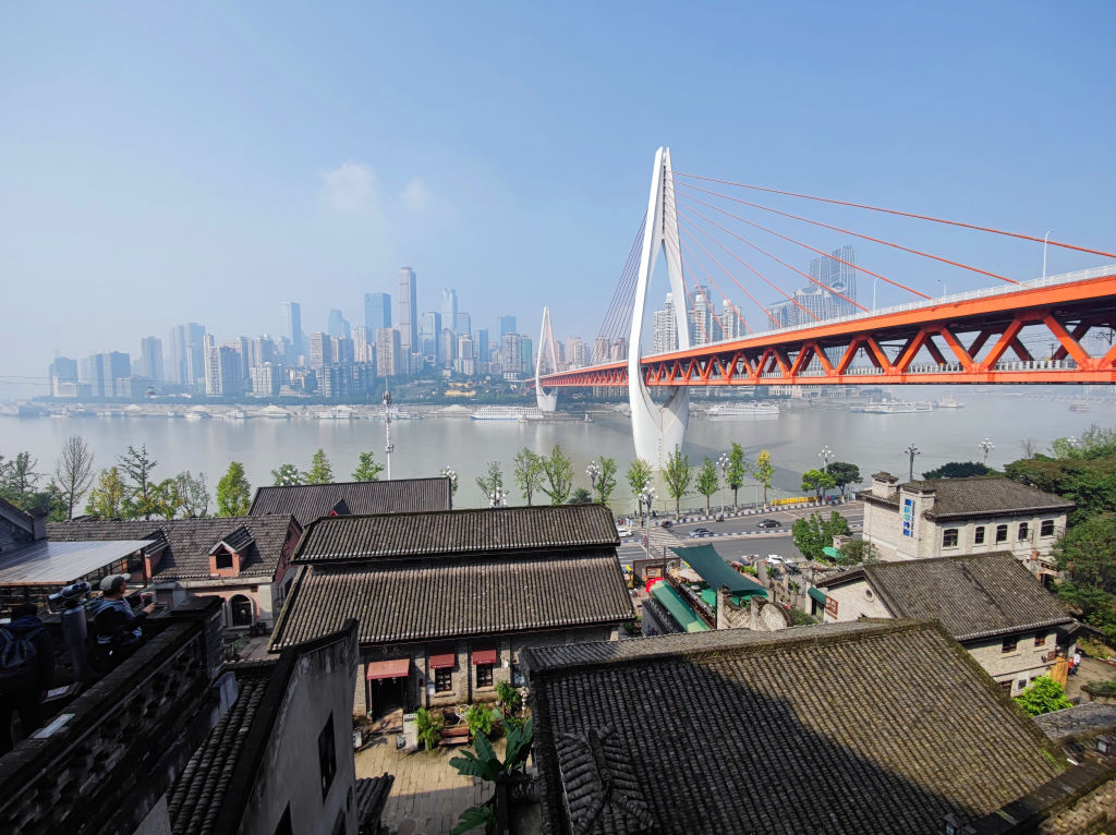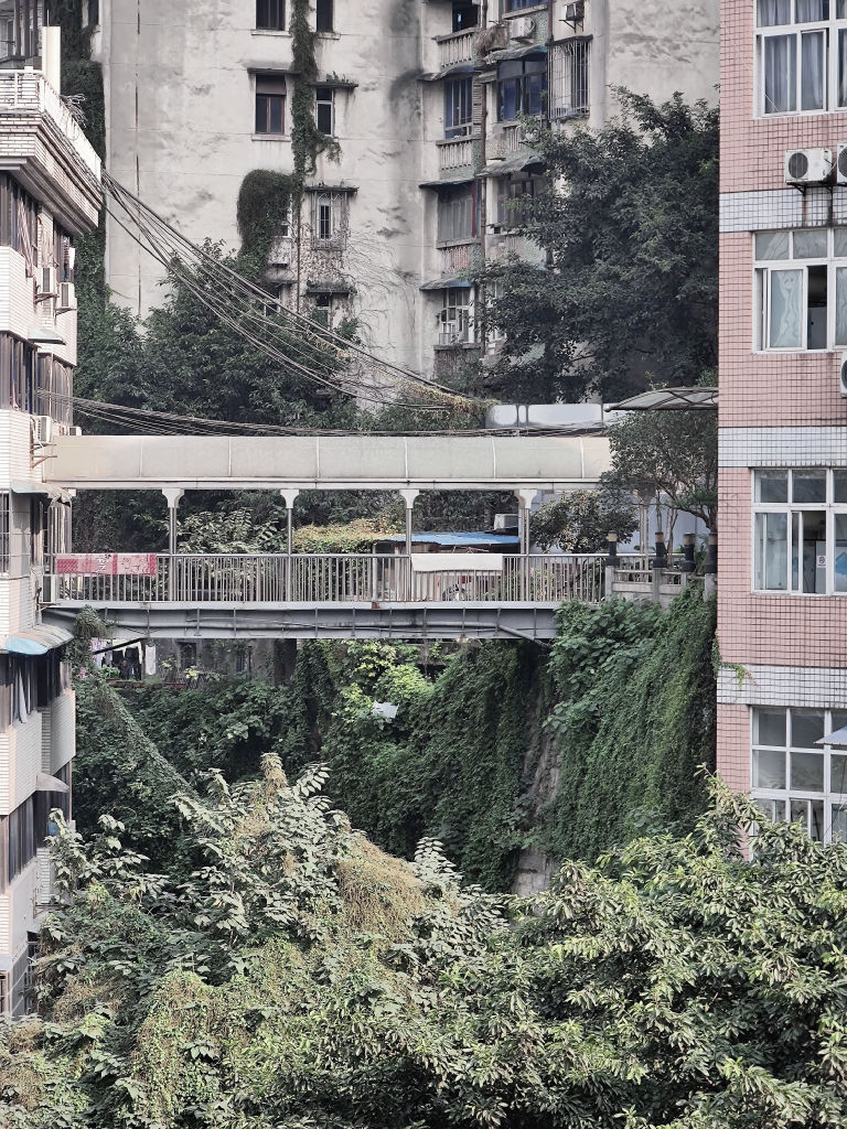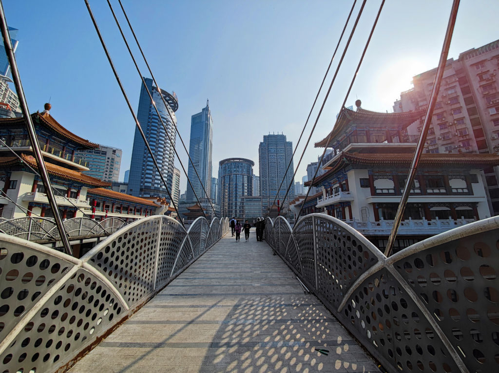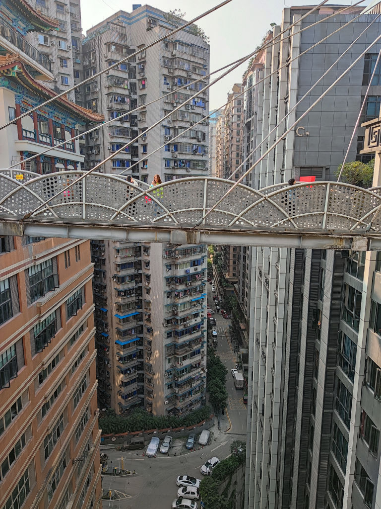 Ce quartier semble fermé depuis la rue, il ne faut hésiter à monter les escaliers sur la droite pour arriver sur cette esplanade qui donne une vue sur les passerelles, mais aussi sur les tours de Yuzhong.