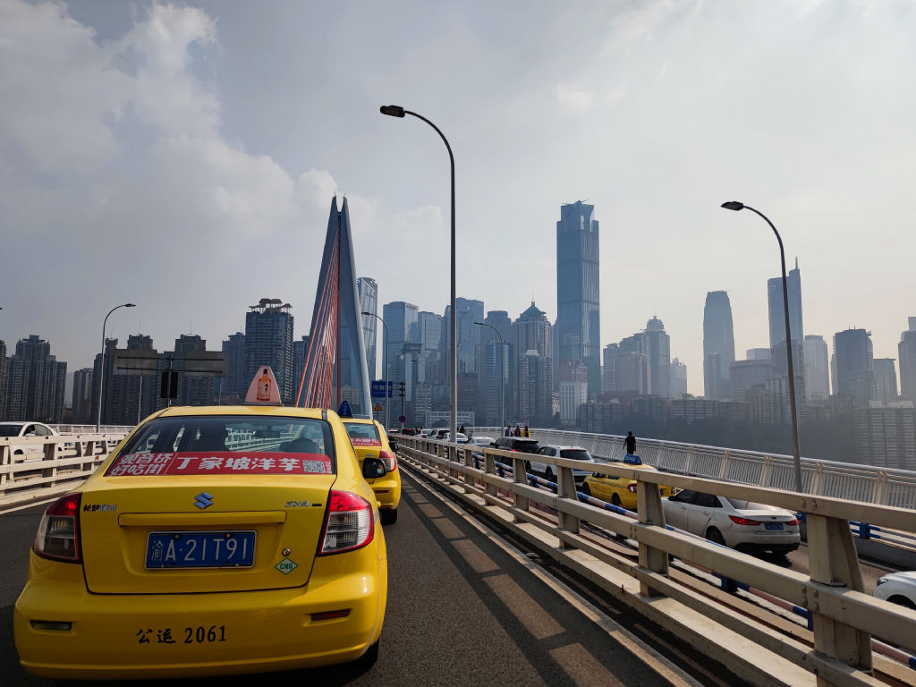 Chongqing est une ville qui est réputée pour ses embouteillages monstres. Surtout au niveaux des ponts qui sont des entonnoirs à voitures. Il est fréquent d'être coincé sur un pont pendant une demi heure à attendre. Certains clients des taxis décident de descendre et finir leur parcours à pieds.