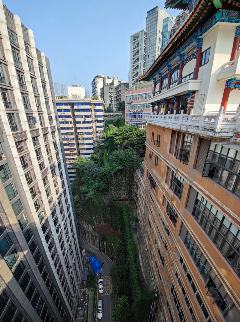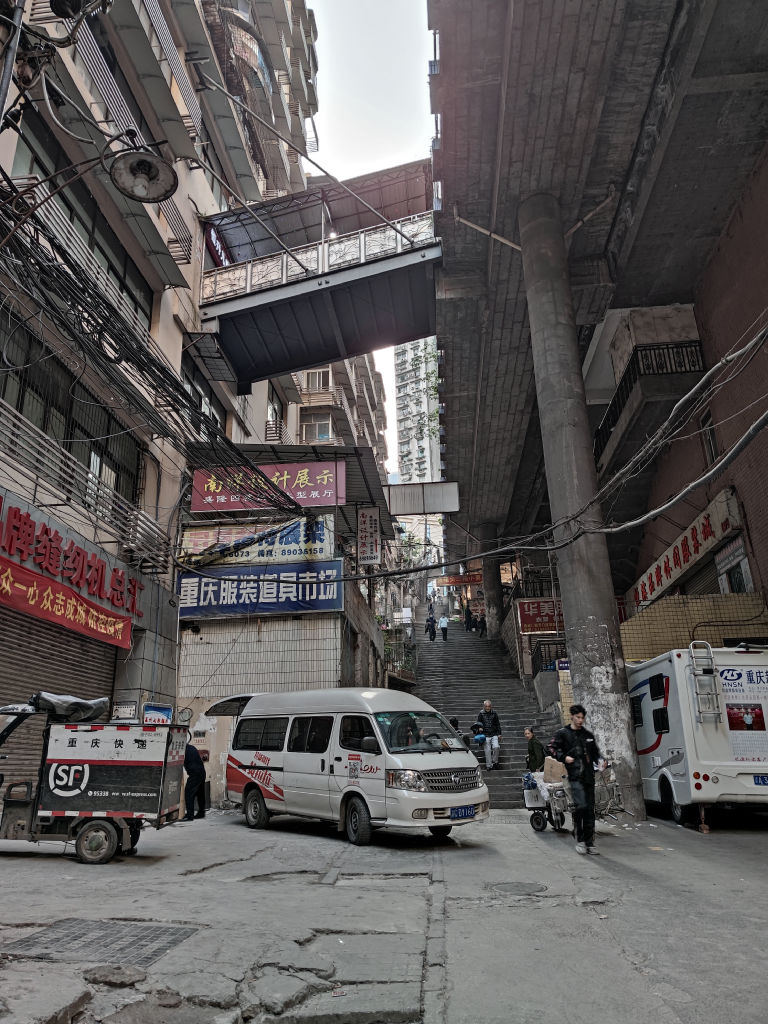 Après un déjeuner dans un véritable style de Chongqing, face à un dépôt de Chang'An, la marque de voitures locale, on reprend notre exploration dans le quartier de Yuzhong, vers Kuixinglou. Autour de Kuixinglou, il y a un dénivelé incroyable, ce qui n'a pas empêché les urbanistes de la ville de lancer de grands projets immobiliers pour héberger tous les habitants. C'est ici qu'on a le plus l'impression d'être dans une version Sichuanaise de Hong Kong.