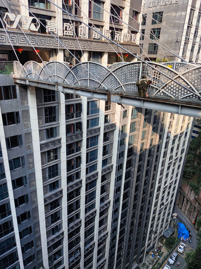 Avant de partir de Kuixinglui, cet ouvrier me donne le vertige. Il est passé de l'autre côté de la passerelle et bricole, à chaque fois qu'il se déplace, il décroche sa sécurité et ne semble pas du tout craindre de tomber, c'est vraiment flippant.