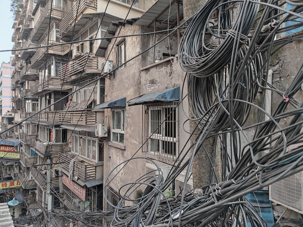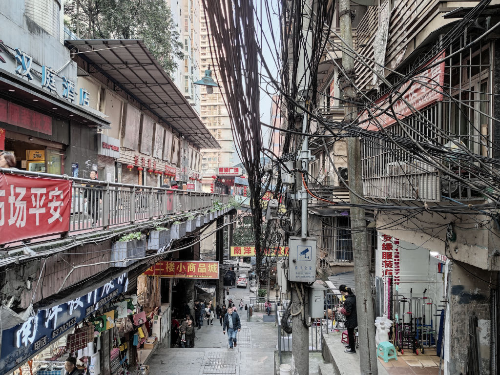 Tout au bout de Yuzhong, on trouve des quartiers tellement désordonnées avec un charme notable. Les fils électriques, les façades brutes, les passerelles, les escaliers, et encore et toujours les fameux joueurs de Mahjong.