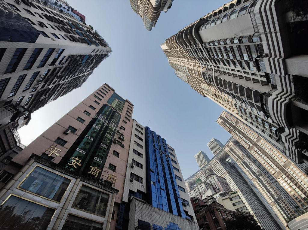 A Yuzhong entre les immeubles d'habitations on a aussi de grandes tours de bureaux.