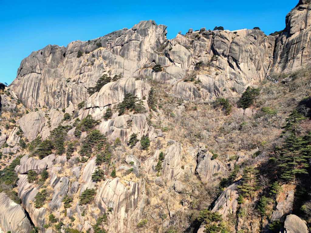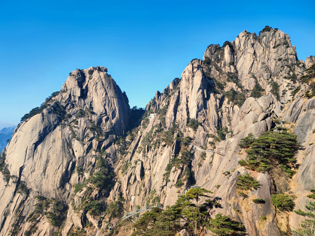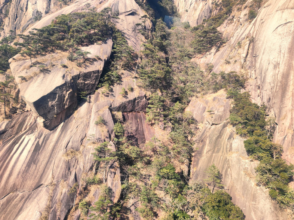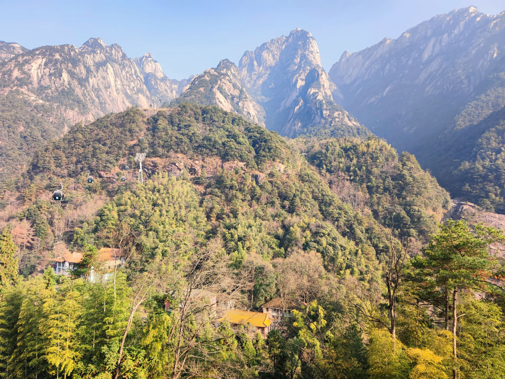 La montée en téléphérique est déjà magnifique, on survole les parois granitiques sur lesquels on arrive à apercevoir des singes. Des pins ont réussi à trouver un interstice dans la pierre pour s’accrocher et pousser au-dessus du vide.