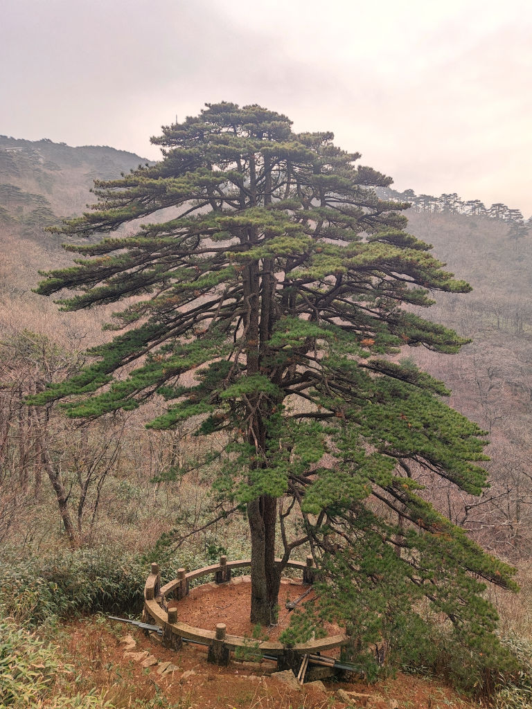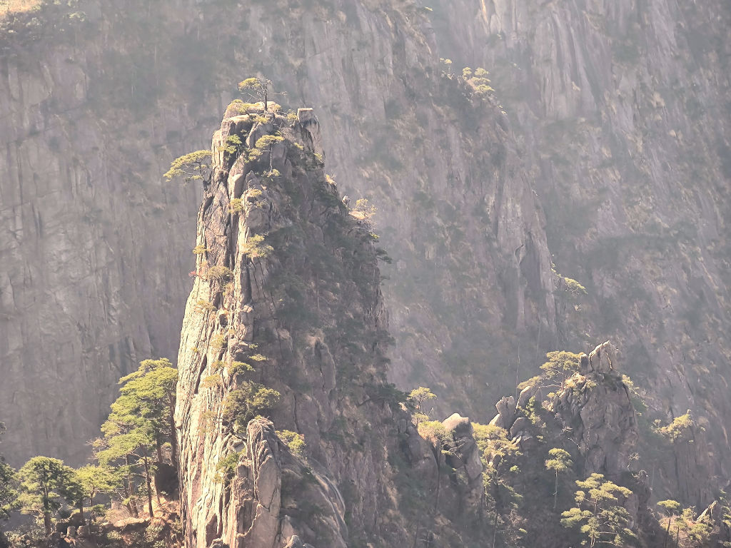 Nous arrivons rapidement devant un des pins les plus connus des Montagnes Jaunes, Yingke Shu, protégé derrière une barrière mais qui attire tous les touristes pour une photo souvenir avec cette vue classique en fond. En matinée, on a le soleil de face, ce qui n’est pas idéal pour les photos, pour cela il vaudrait mieux revenir en fin de journée, mais on sera de l’autre côté donc impossible malheureusement, c’est quand même un point noir de faire le sentier des montagnes jaunes dans le sens Ouest – Est.