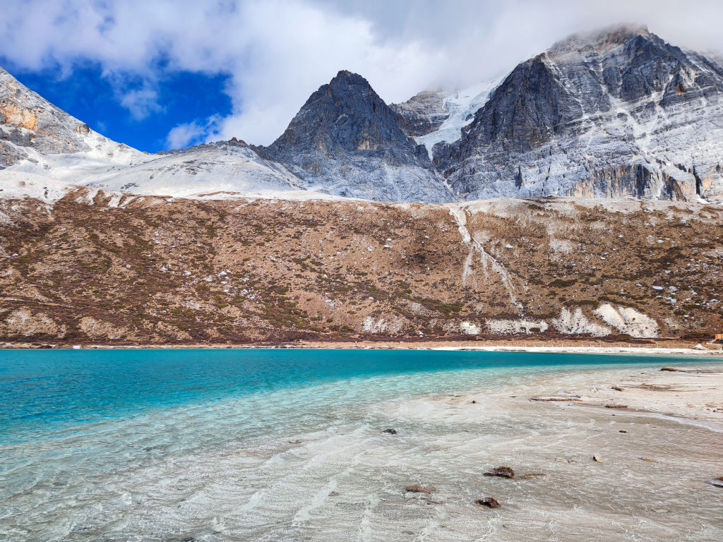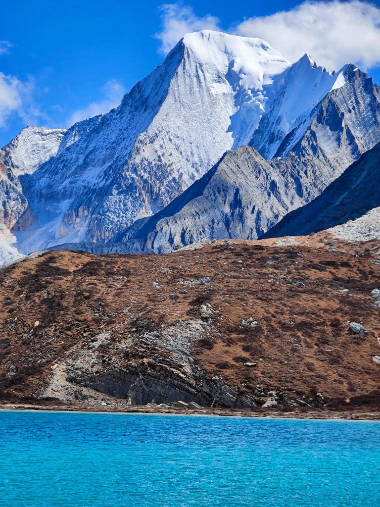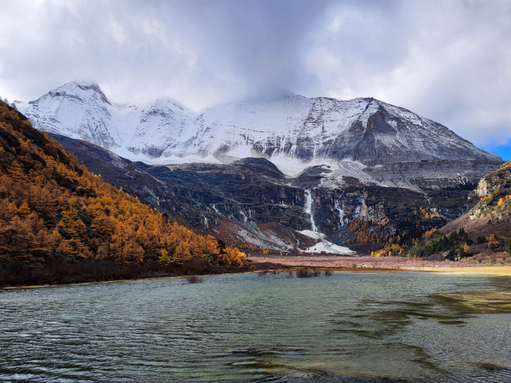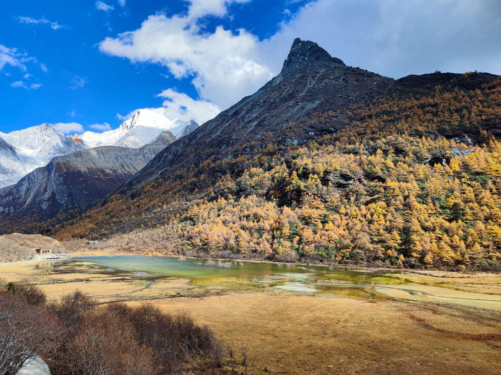 Depuis le bout du lac, on a une vue directe sur le mont Xianuoduoji.