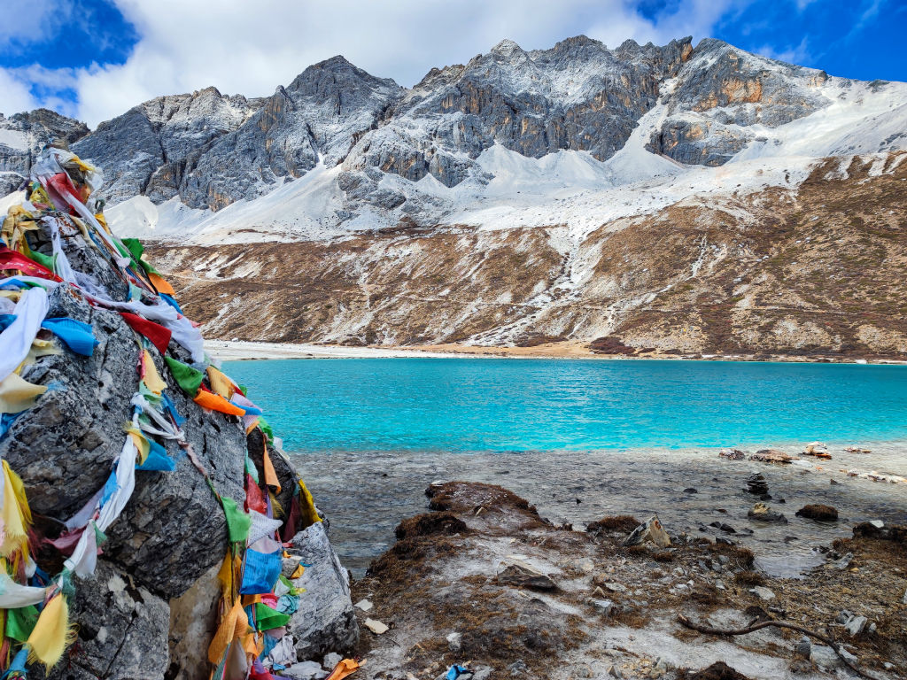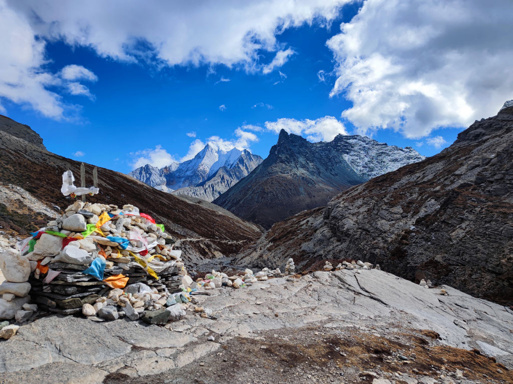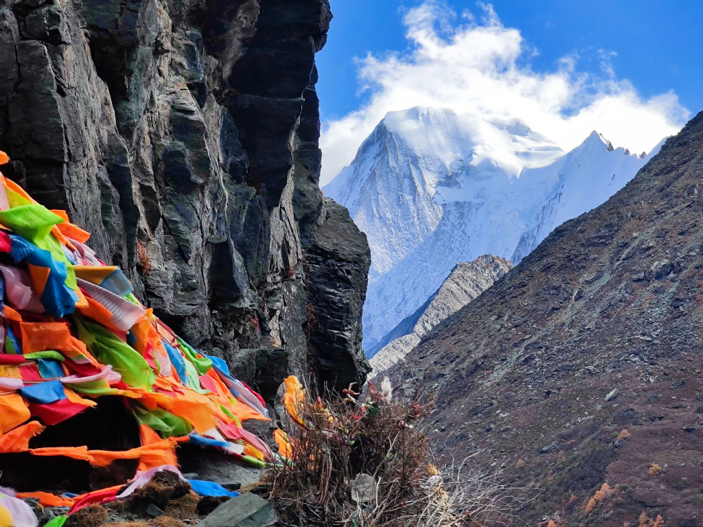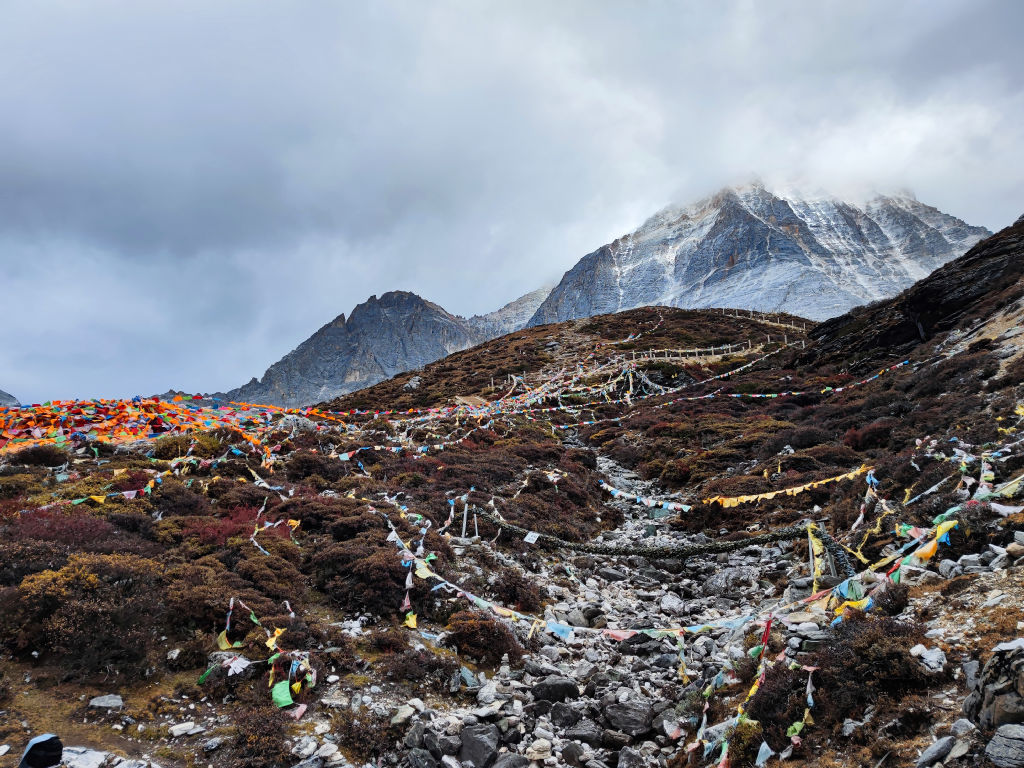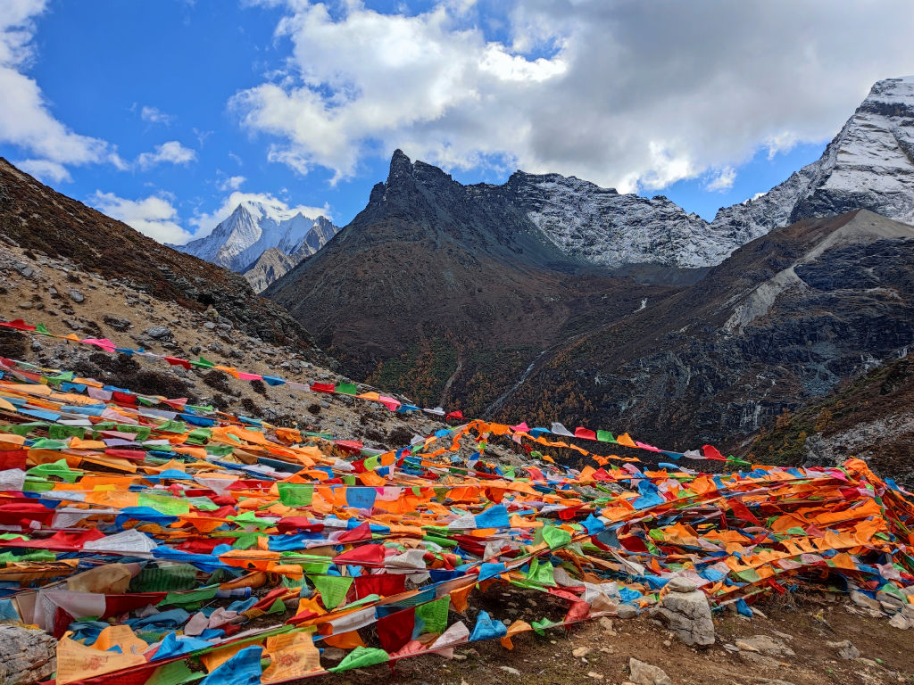 La zone est soumise à un grand vent et on trouve de nombreuses prières colorées tibétaines.