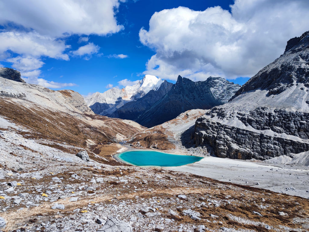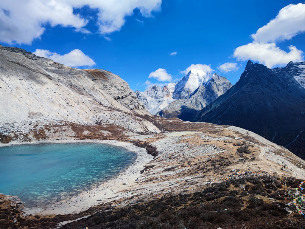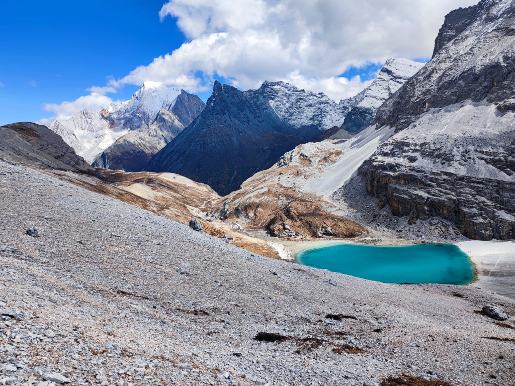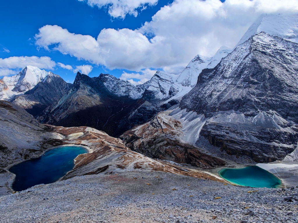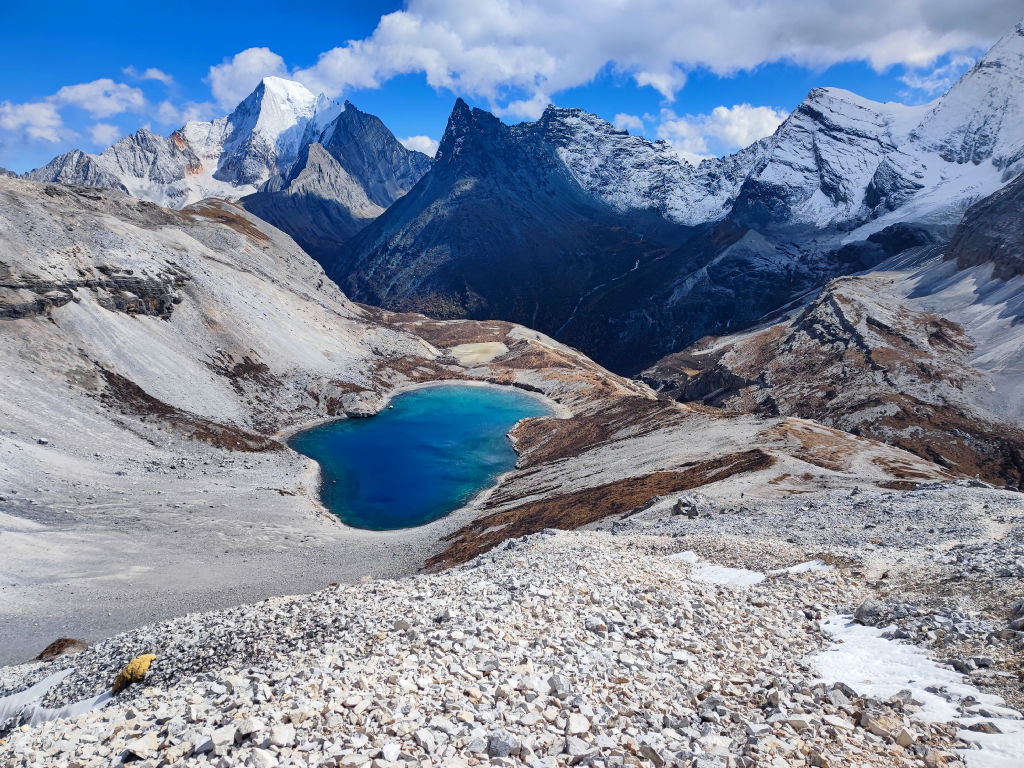 Je remarque un promontoire en haut d’un pierrier, de là haut on devrait avoir une vue panoramique sur les lacs et les montagnes majestueuses de Yading. Je suis déjà pas mal fatigué par la marche d’approche des lacs mais je me dis que si je suis venu jusqu’ici, je peux quand même essayer. Il faut grimper dans le pierrier en faisant attention à ne pas glisser, et surtout il faut éviter de se carboniser car on est de plus en plus haut, la montée est laborieuse.