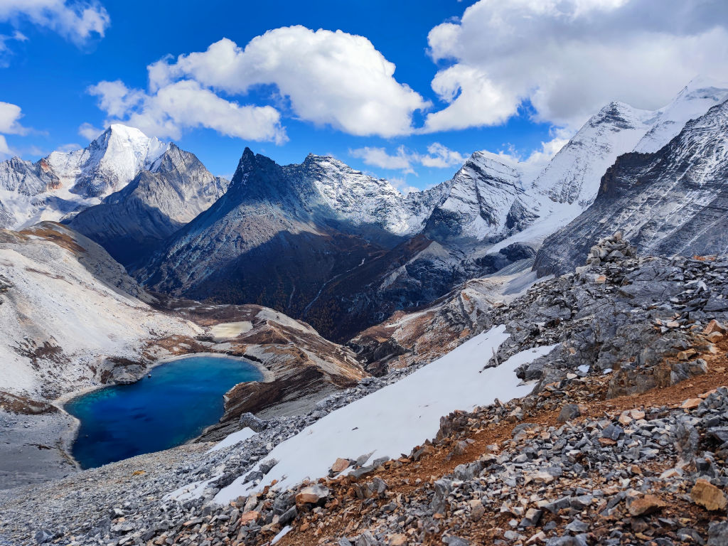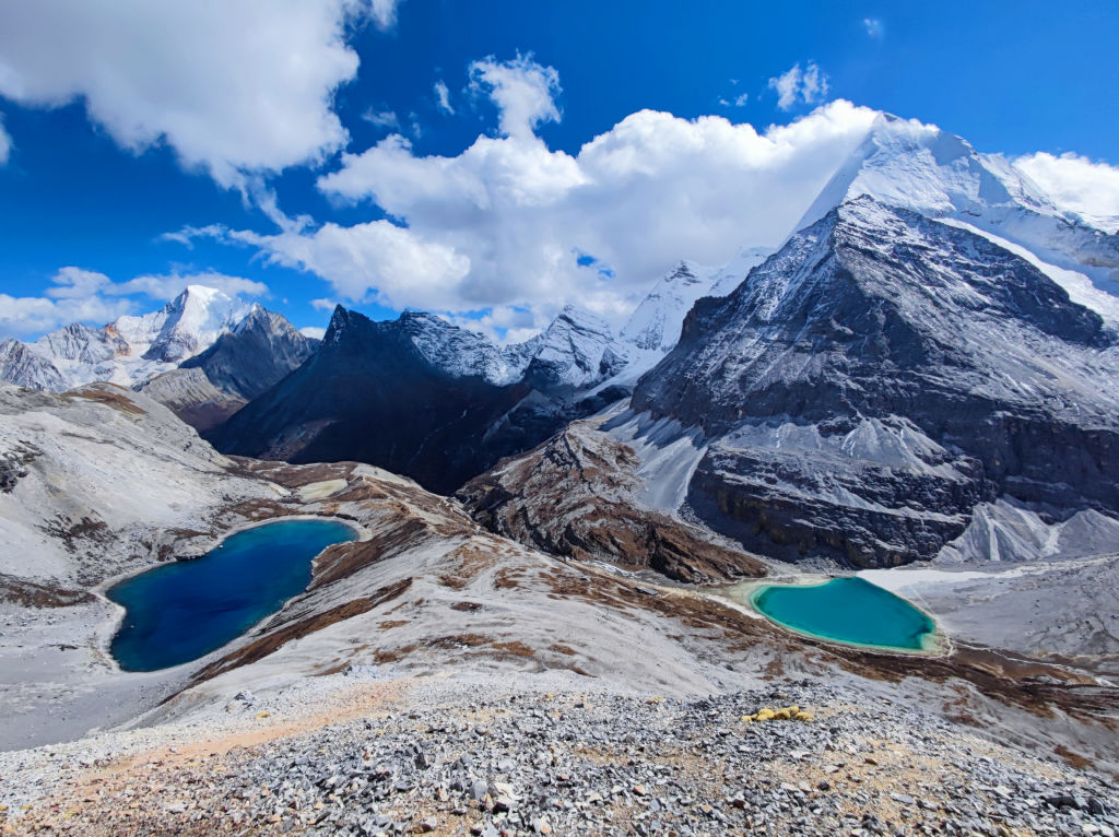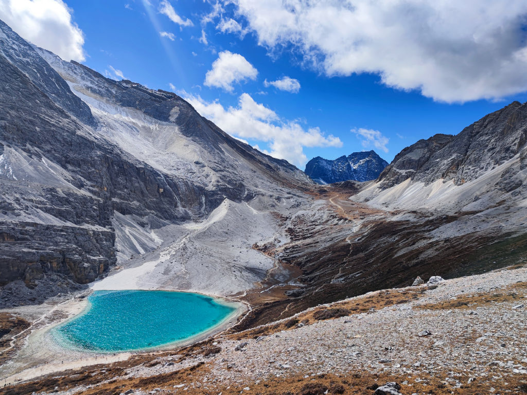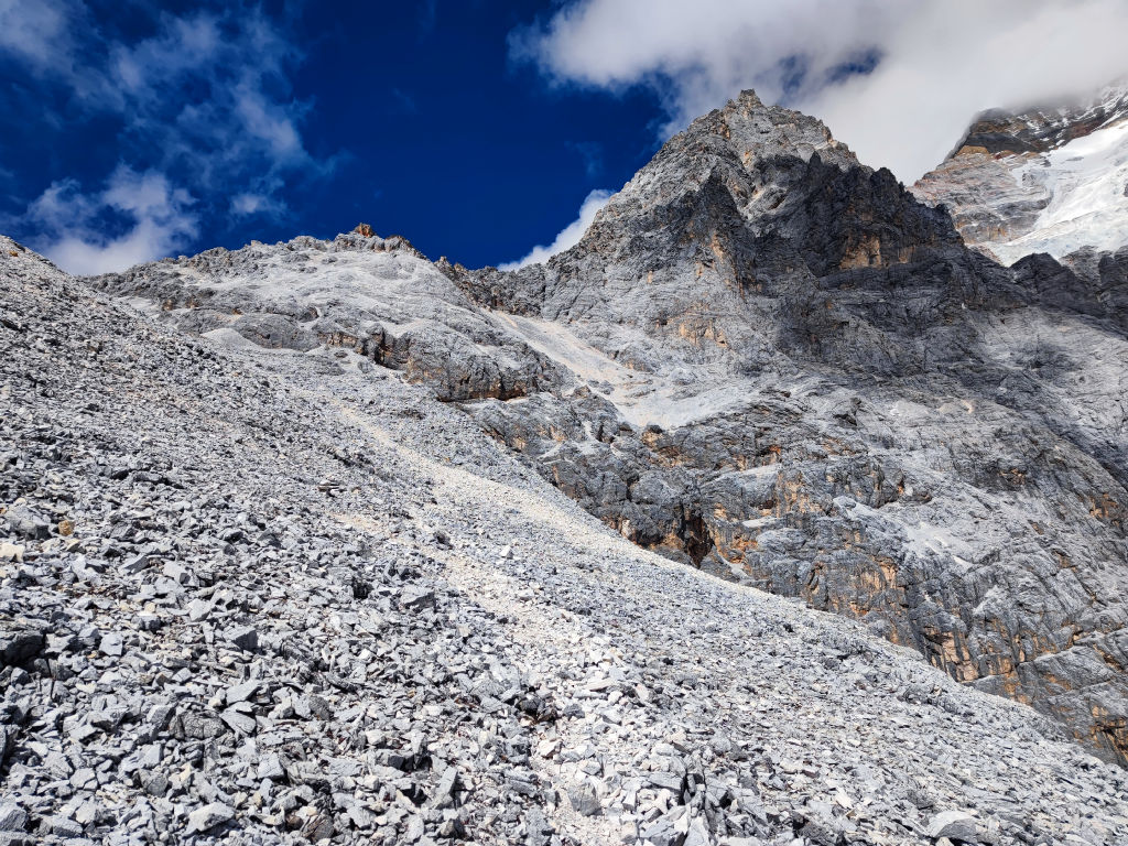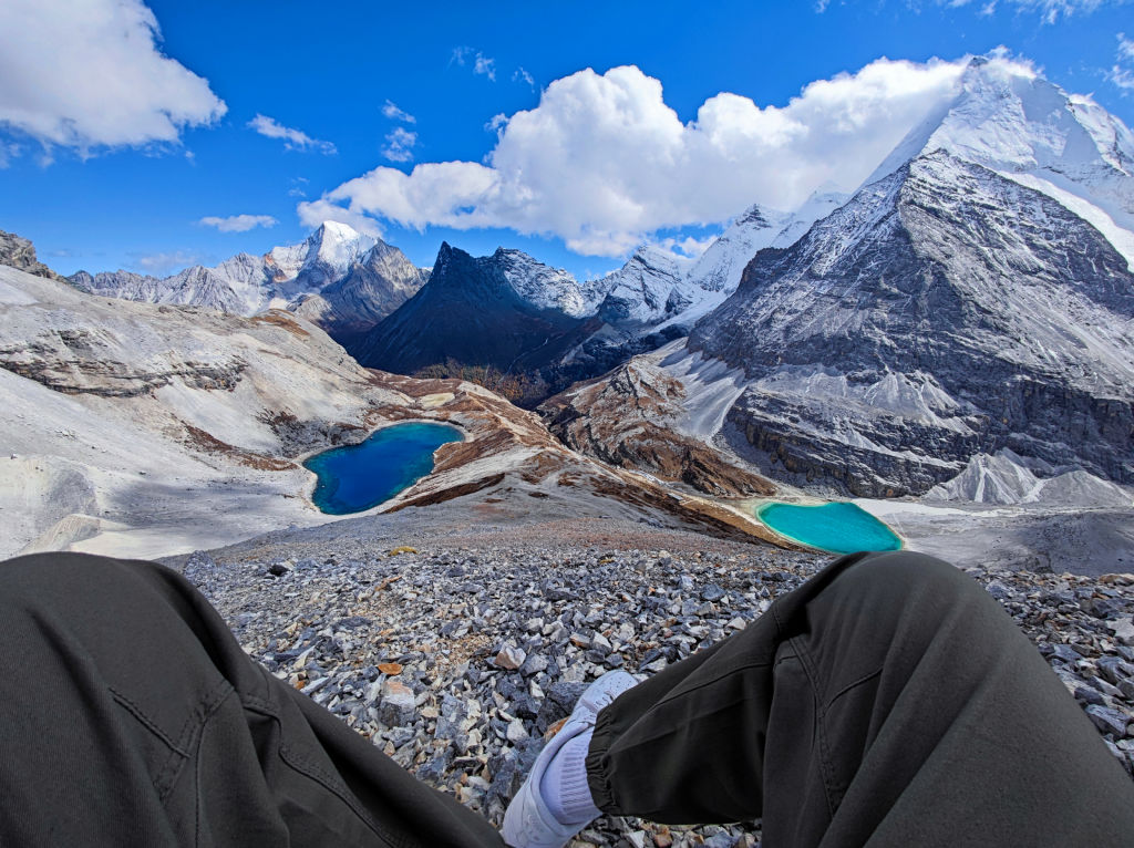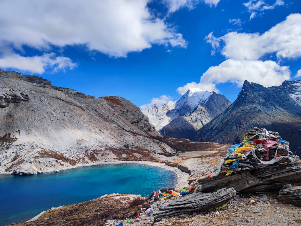 Je remarque un promontoire en haut d’un pierrier, de là haut on devrait avoir une vue panoramique sur les lacs et les montagnes majestueuses de Yading. Je suis déjà pas mal fatigué par la marche d’approche des lacs mais je me dis que si je suis venu jusqu’ici, je peux quand même essayer. Il faut grimper dans le pierrier en faisant attention à ne pas glisser, et surtout il faut éviter de se carboniser car on est de plus en plus haut, la montée est laborieuse.