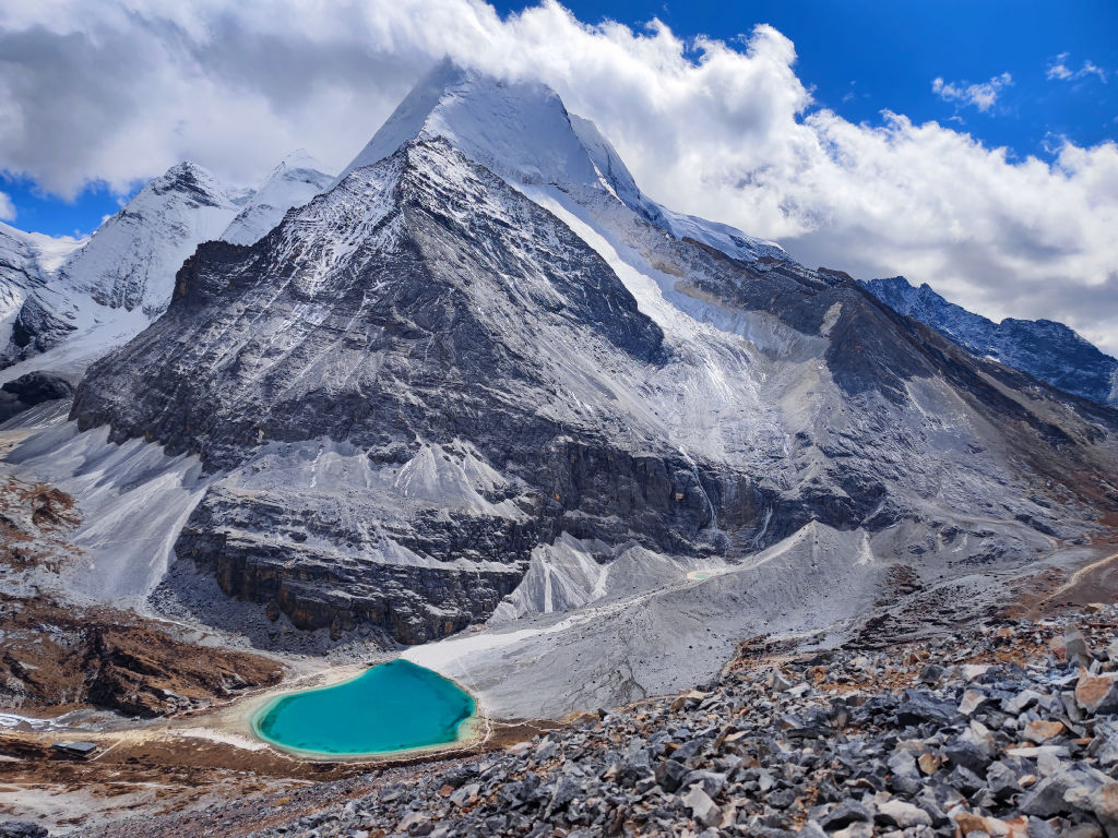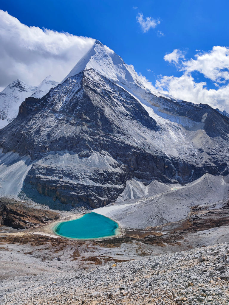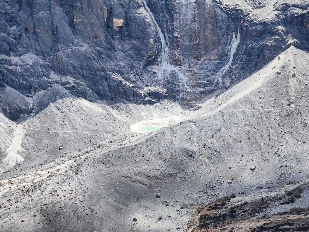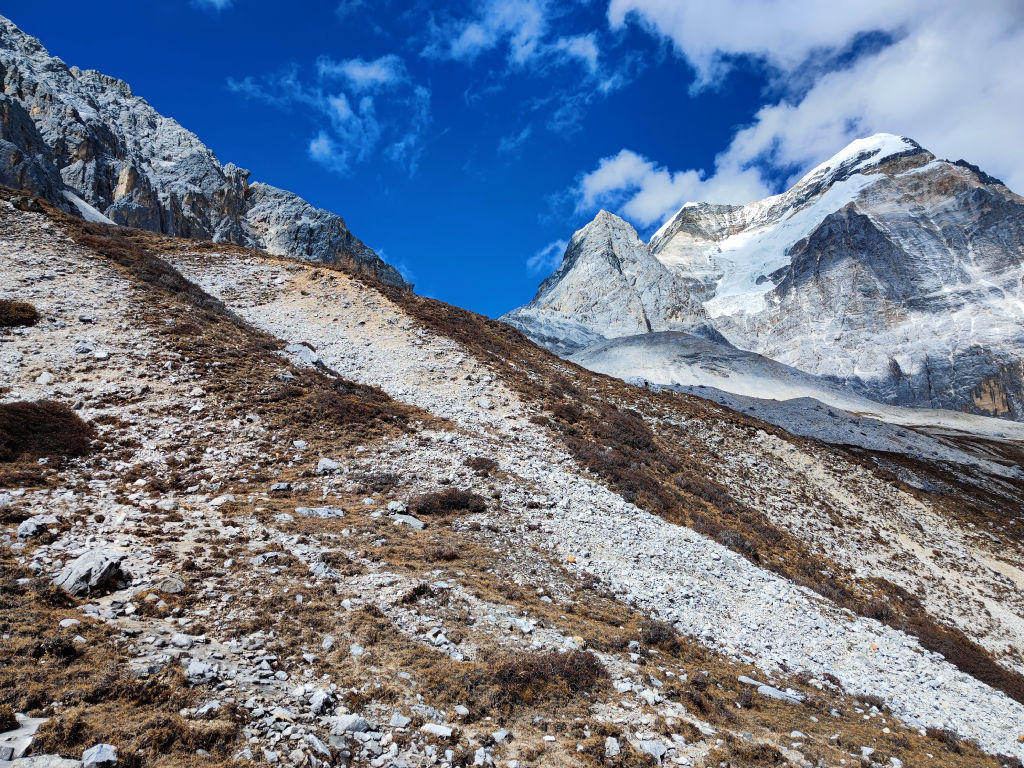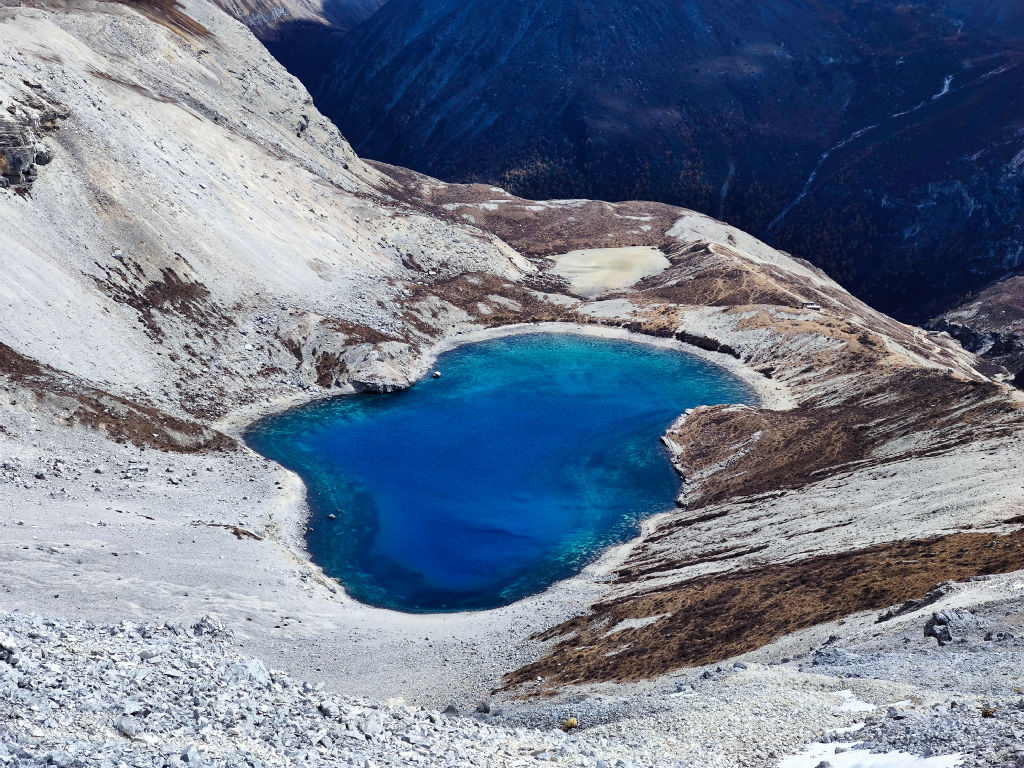 Je remarque un promontoire en haut d’un pierrier, de là haut on devrait avoir une vue panoramique sur les lacs et les montagnes majestueuses de Yading. Je suis déjà pas mal fatigué par la marche d’approche des lacs mais je me dis que si je suis venu jusqu’ici, je peux quand même essayer. Il faut grimper dans le pierrier en faisant attention à ne pas glisser, et surtout il faut éviter de se carboniser car on est de plus en plus haut, la montée est laborieuse.
