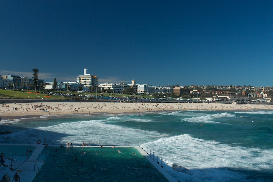 Sydney est une immense ville qui s'étend du coeur de la baie jusqu'aux bords de l'océan. Le quartier de Bondi, à l'Est de Sydney et au bord de la mer, est réputé pour sa plage, sa piscine et son ambiance Côte d'Azur Australienne. Bondi beach est très touristique. Il n'empeche, l'environnement est splendide et la plage parmi les plus belles que nous allons voir, et la ballade à flanc de falaise en direction de Bronte beach nous en met encore plein les yeux.