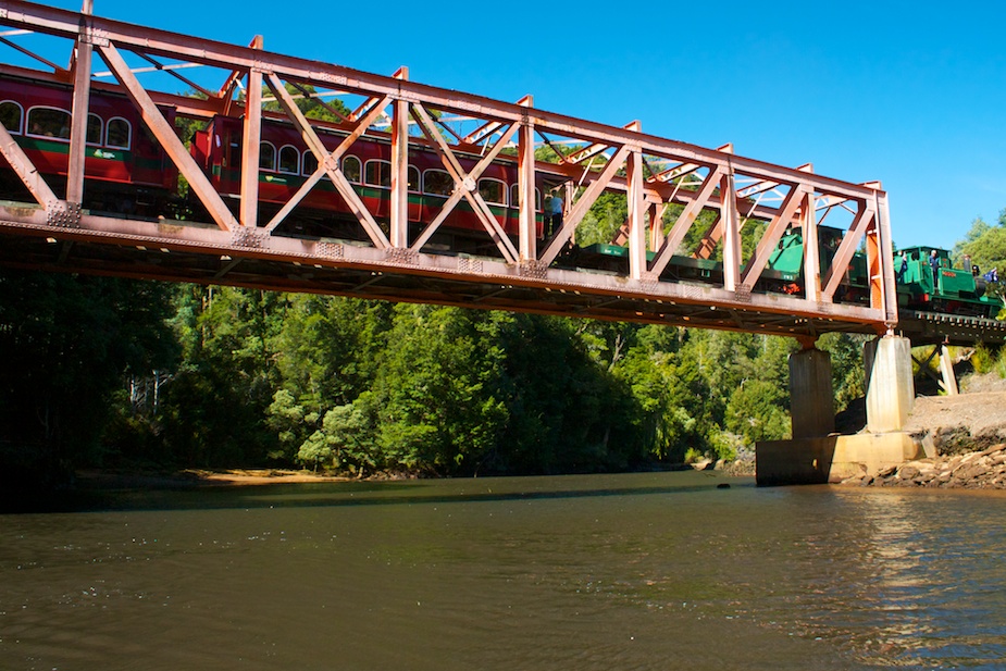 Il fait beau à Strahan ce qui est rare selon les locaux. On en profite pour faire du jetboat avec un objectif amusant : suivre le vieux train à vapeur qui longe une rivière du parc naturel du Sud Ouest de la Tasmanie, protégé par l'UNESCO pour sa rainforest. C'est aussi la fête nationale donc avant nous nous mélons à la fête qui est donnée dans le parc.