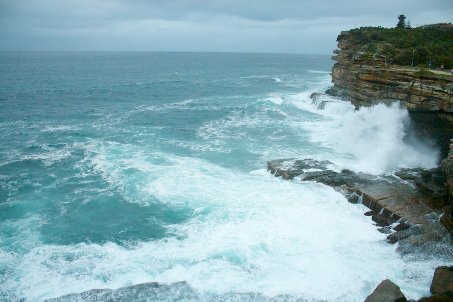 De retour à Sydney de notre périple de 1300 kilomètres depuis que nous avons quitté Melbourne, nous mangeons sur la plage de Bronte Beach puis visitons le bout de la baie de Sydney, à Watson Bay où les vagues de l'Océan Pacifique érodent les falaises. Malheureusement, il ne fait très beau et les vagues sont monstrueuses, bien entendu aucun surfeur n'ose mettre les pieds dans l'eau. Mais sur les falaises qui bordent l'océan, le spectacle est grandiose.