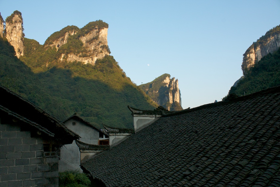 <p>Les montagnes reprennent un peu la forme escarpée Zhangjiajie et le coucher de soleil donne de belles couleurs à la nature. </p>