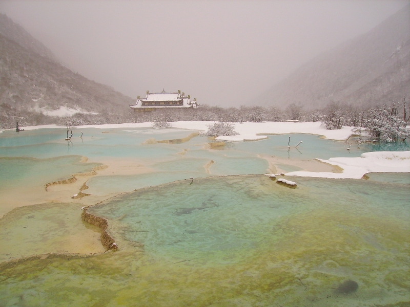 Cette nuit, la neige est tombée sans interruption. Au réveil, les montagnes qui, la veille étaient teintées de brun et de beige sont maintenant toutes blanches. Il fait froid. Je rejoins les Taiwanais et nous petit déjeunons à coté de l’auberge. Des Jiao Zi de bon matin, ça calle !