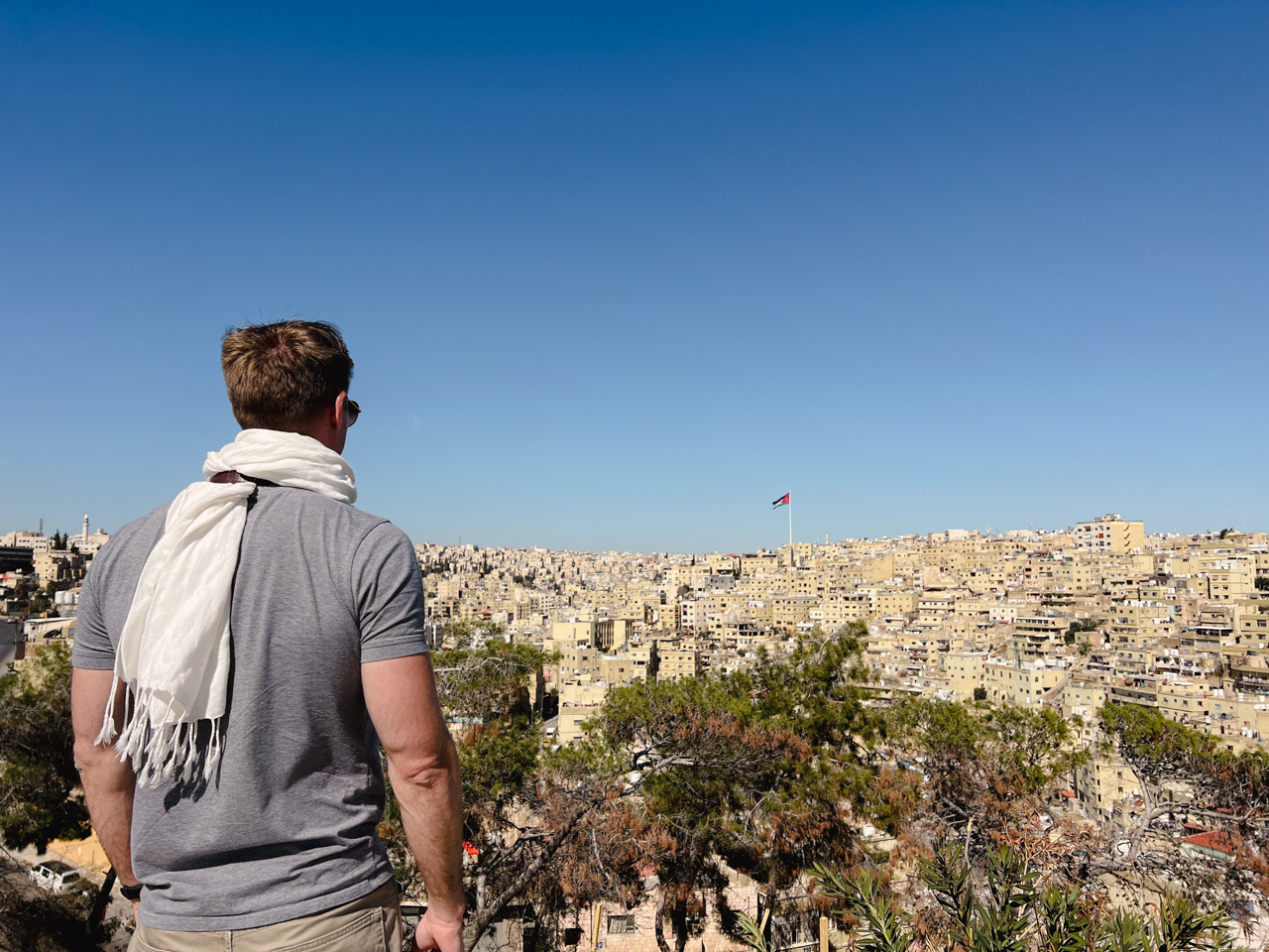 Sur les conseils de Samir, on décide de passer à Amman. En fait la capitale de la Jordanie n’est pas loin et on peut facilement faire l’aller retour bien que l’on soit logé à la Mer Morte. Avant de rejoindre la plus grande ville du pays, on remonte la dépression par la route du Mont Nébo. Cette route traverse des paysages magnifiques, jusqu’à l’endroit présumé où Moïse aurait pointé à son peuple la terre promise avant de poursuivre jusqu’à Amman.